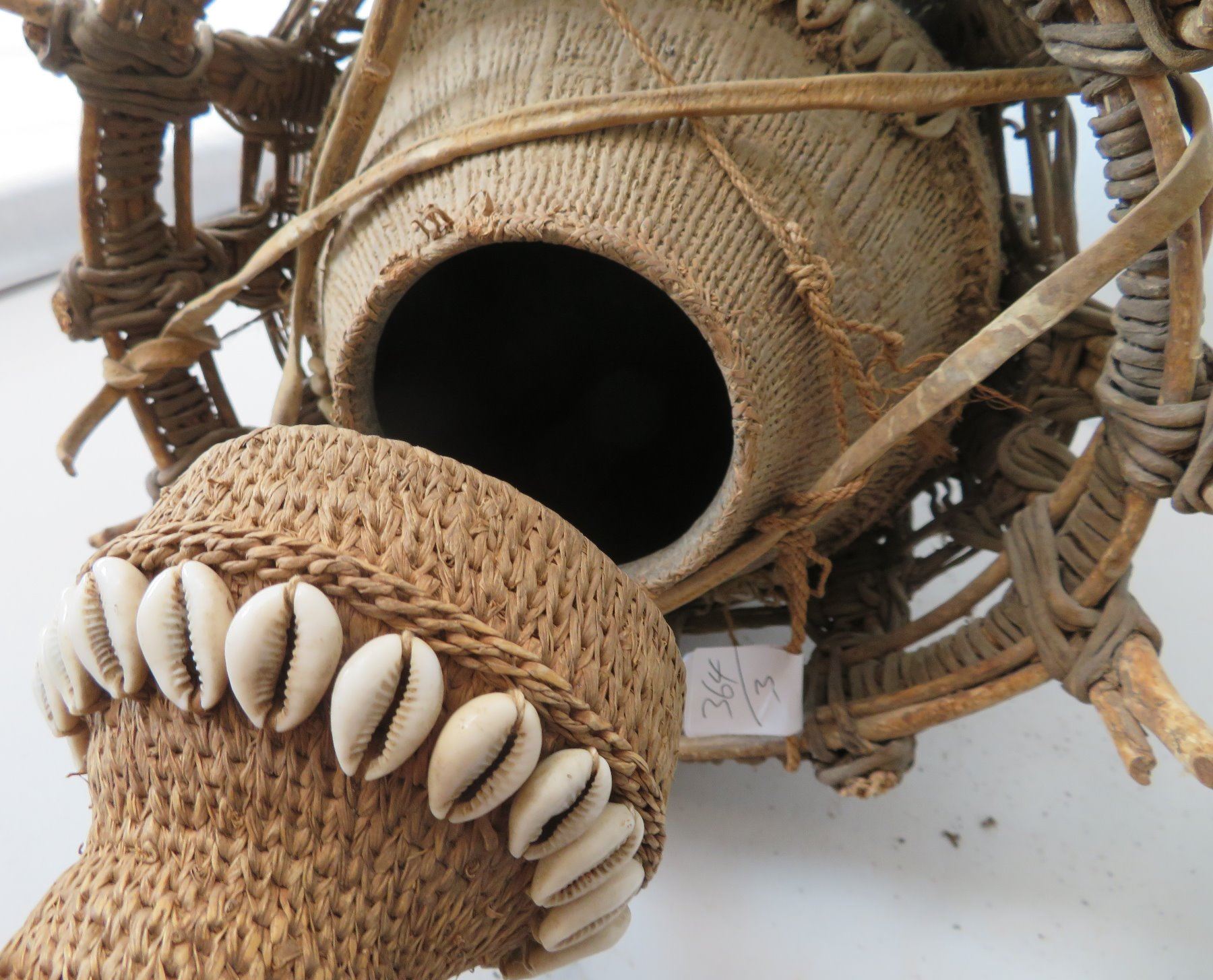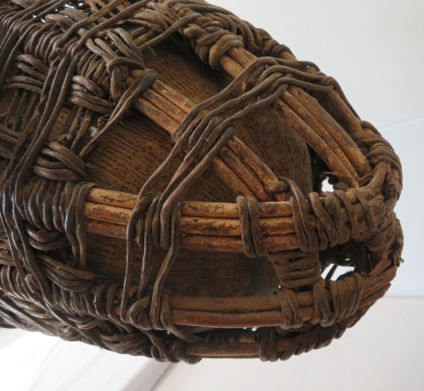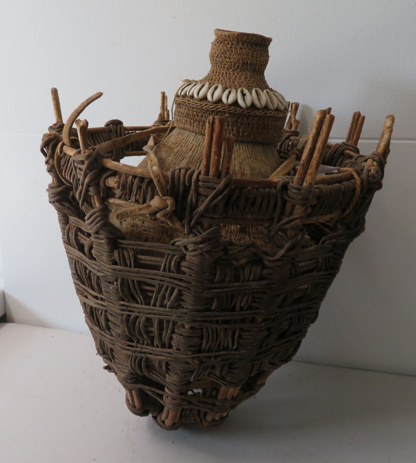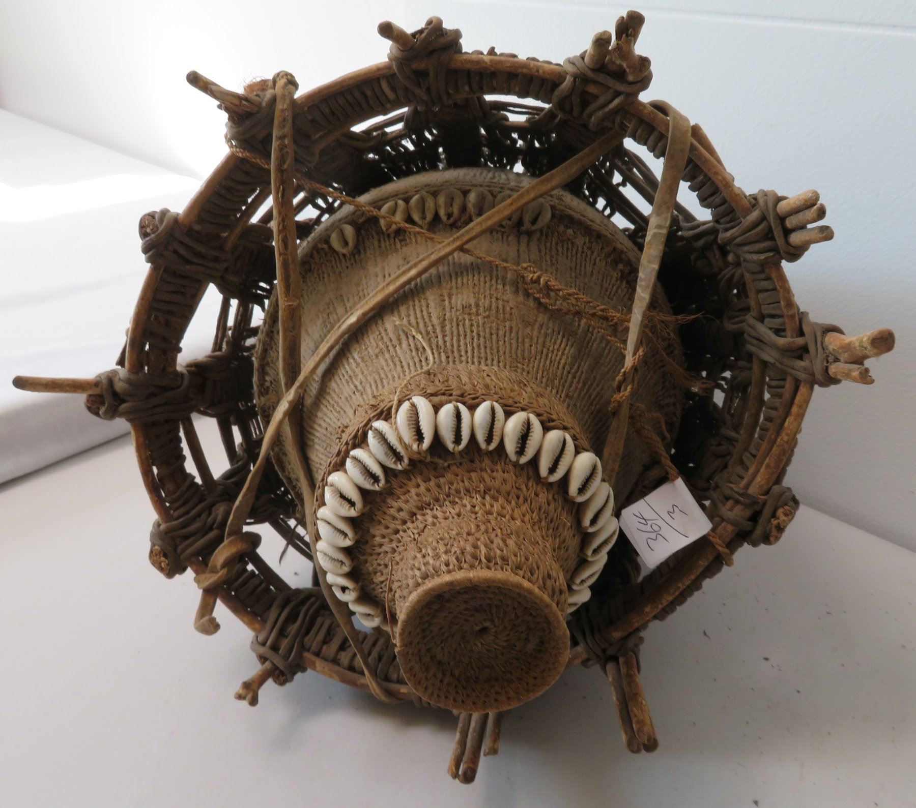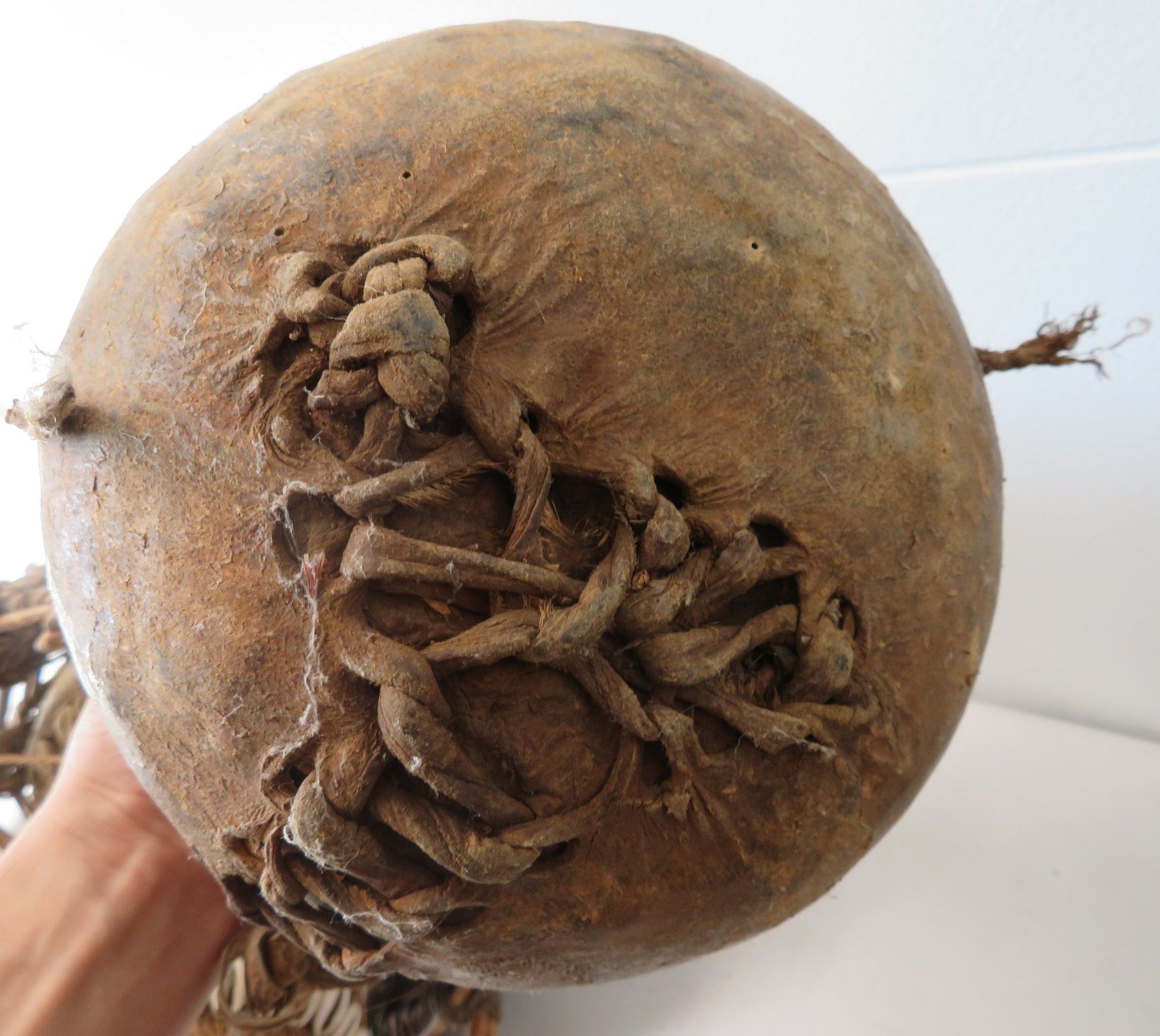 3 Antique African Containers, c. 1930s. Made of wood, fiber and leather, the largest item measures 16" x 12". Masai, South Africa. Condition: All worn and used, see images. Shipping: $60.00 w/insurance and signature, due to size.