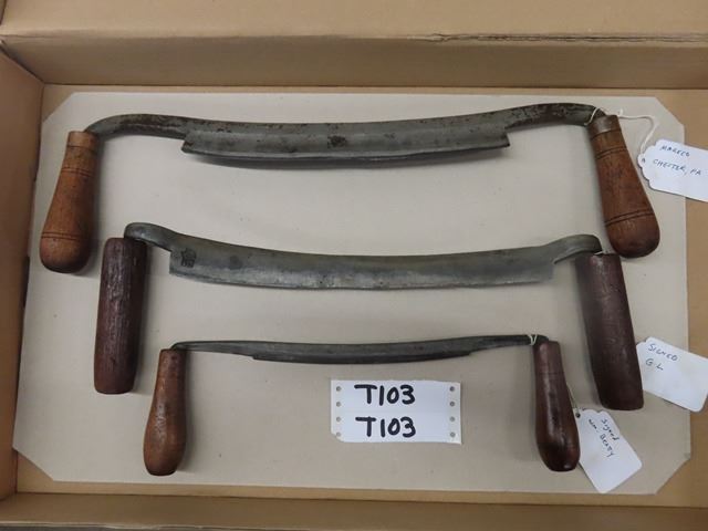 3 Antique Draw Knives: Longest at 20” -great handles + little rust on the bar. The knife is 11” wide + sharp but is not completely even. A little work would have it ready to use or admire - marked Chester. PA + (2nd) draw knife at 17” in width appears all original. The knife alone is 12” It is marked GL. The last of the draw knives is 14” in length + in great original condition. The knife is 7” wide and very sharp. It is signed Wm. Beauty.