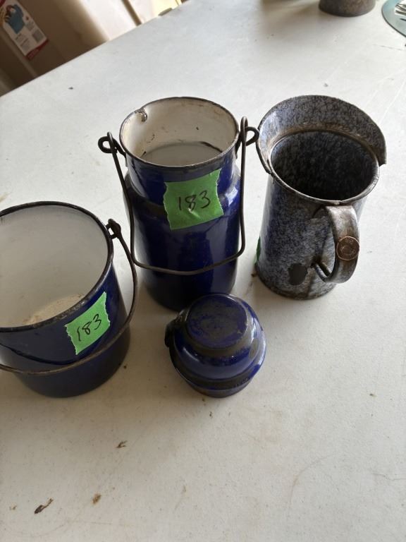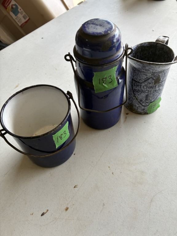 3 Antique Enamel Pieces:1 Pint Jug with Graphics