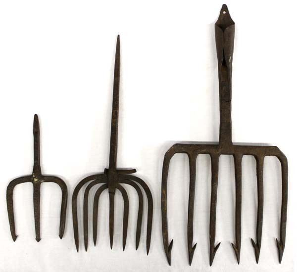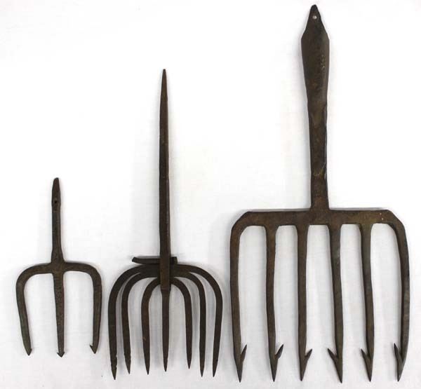 3 Antique Hand Forged Iron Frog & Fish Gigs, includes 1 Trident (3-pronged), largest measures 17''L