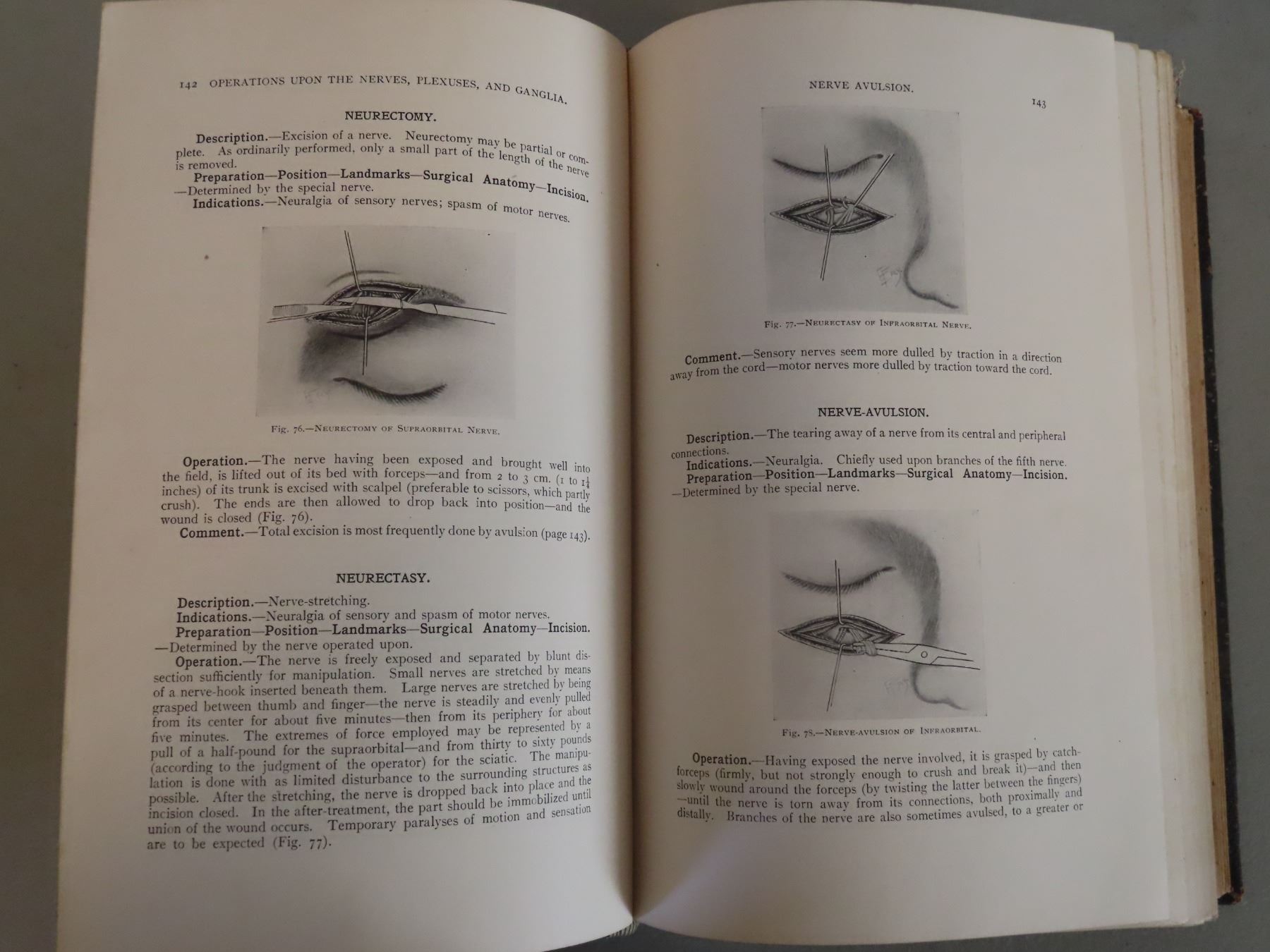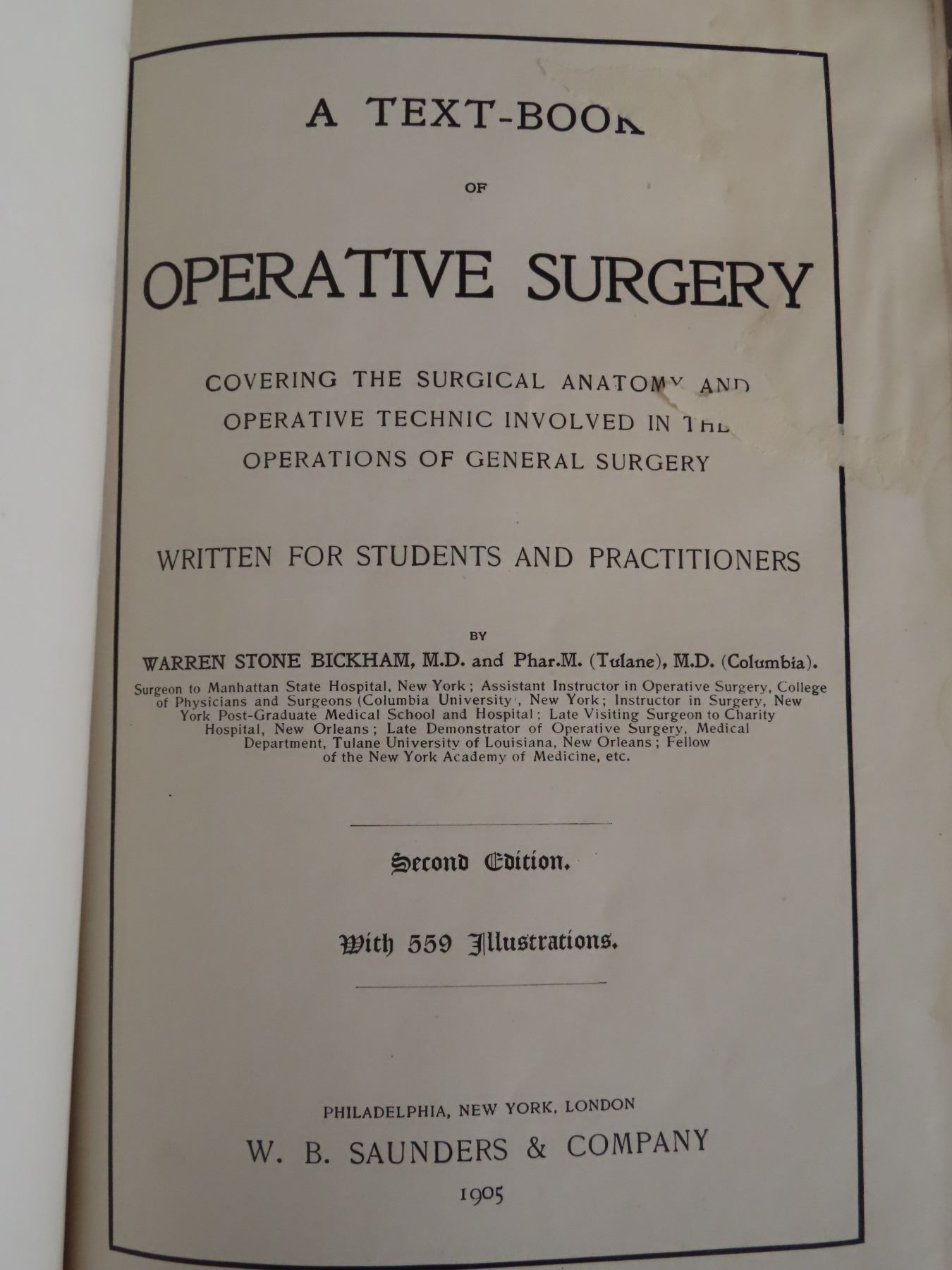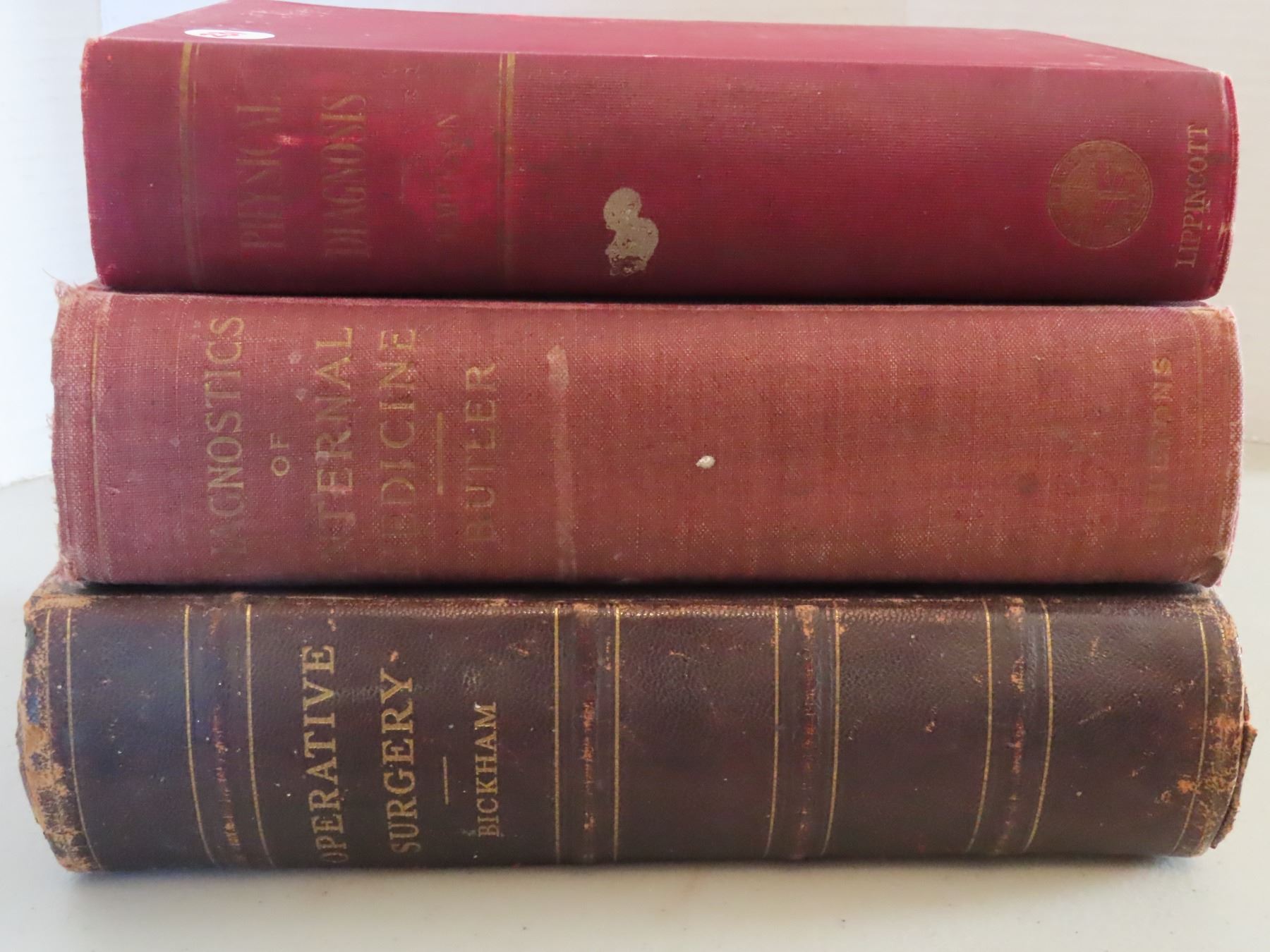 3 Antique books (Operative Surgery by Bickham, Diagnostics of Internal Medicine by Butler, Physical Diagnosis by Emerson) with illustrations