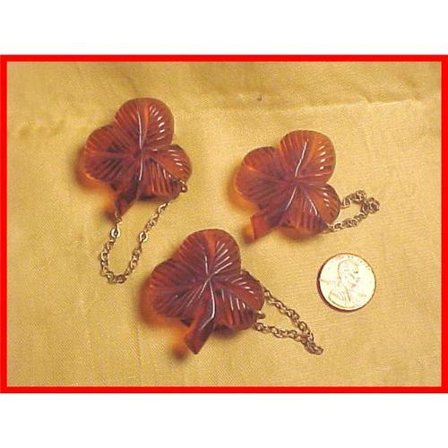 This listing consists of three bakelite clovers with metal snaps on the back. Each applejuice colored clover is carved. Each clover is chained together(one is not attached) with a matching metal back. These bakelite items can be used for closure on an article of clothing. Good condition. Each clover is 1-3/4" by 1-3/8" by 1/4" thick. A unique set of carved bakelite items.