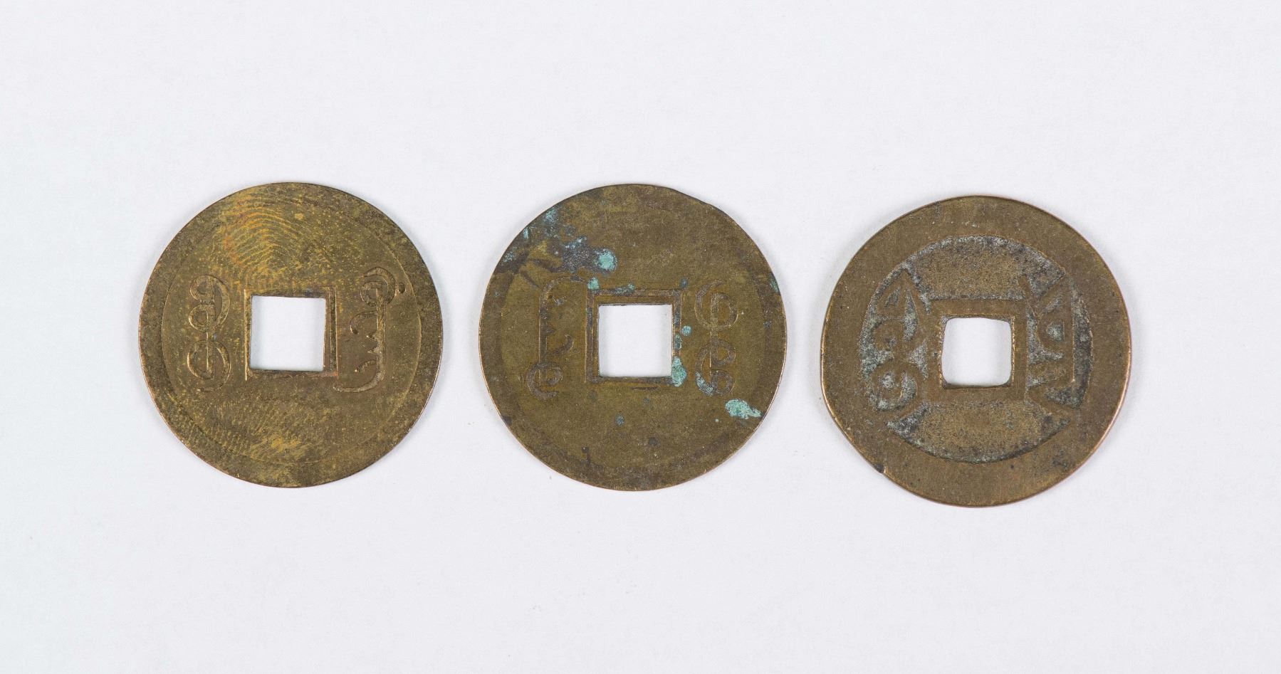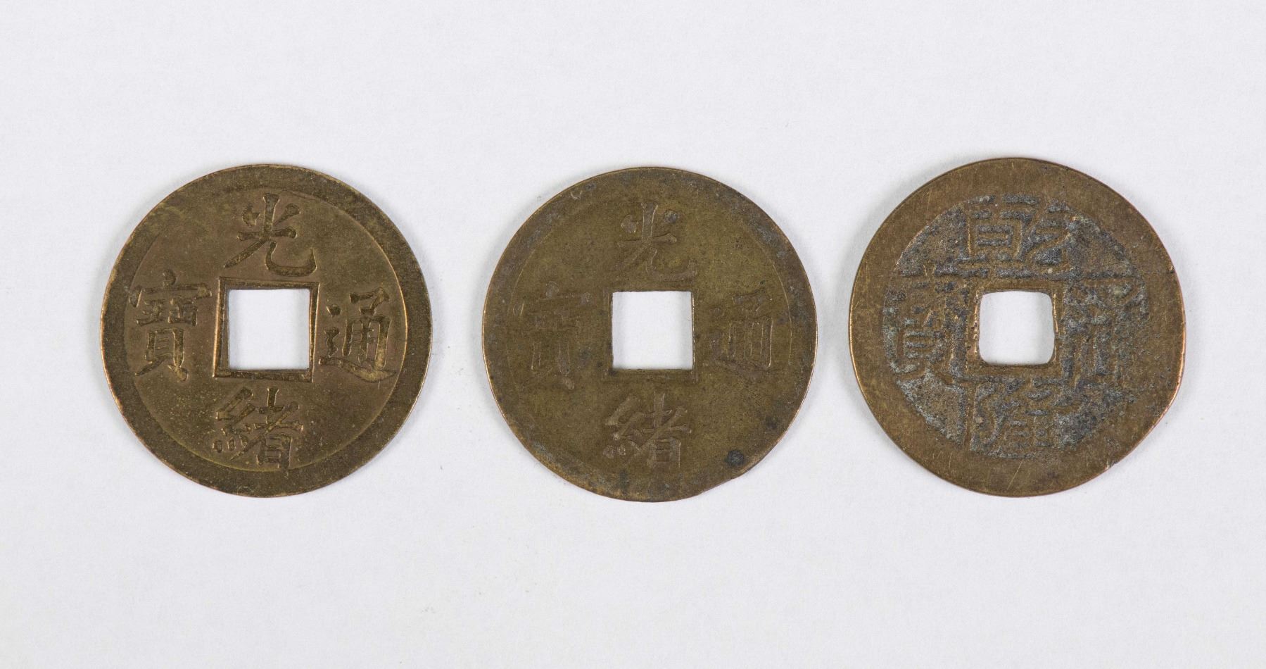 Three (3) Chinese bronze coins; comprised of two Guang Xu Tong Bao and one Qian Long Tong Bao; D: 2 cm, 10 grams