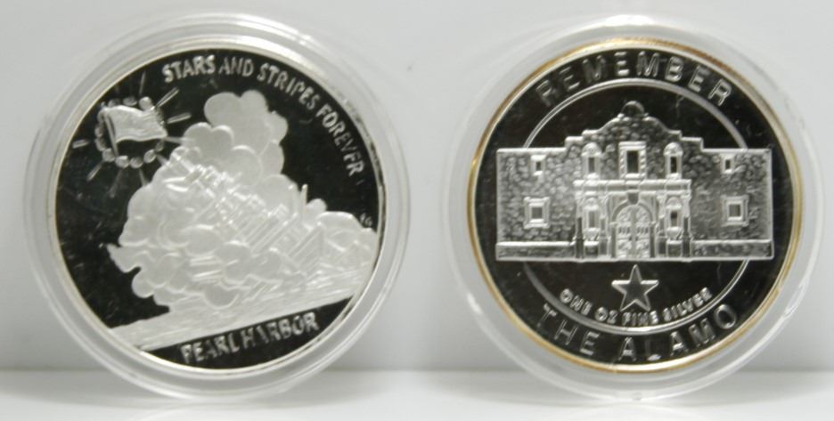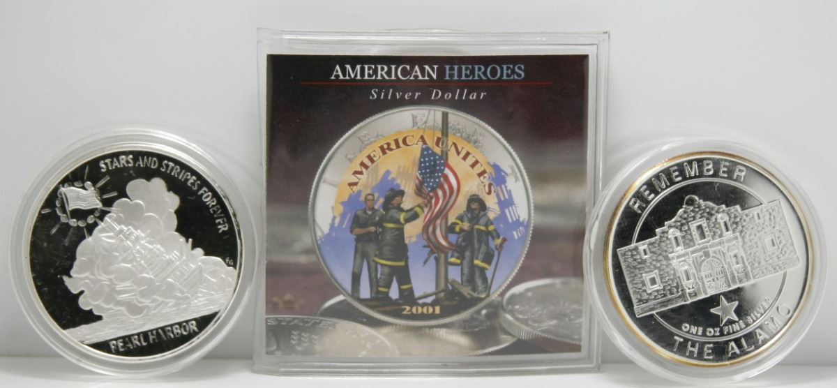 3 Assorted 1 Oz. Fine Silver USA Coins: Pearl Harbour, Alamo & 2001 Painted Eagle - NO TAX