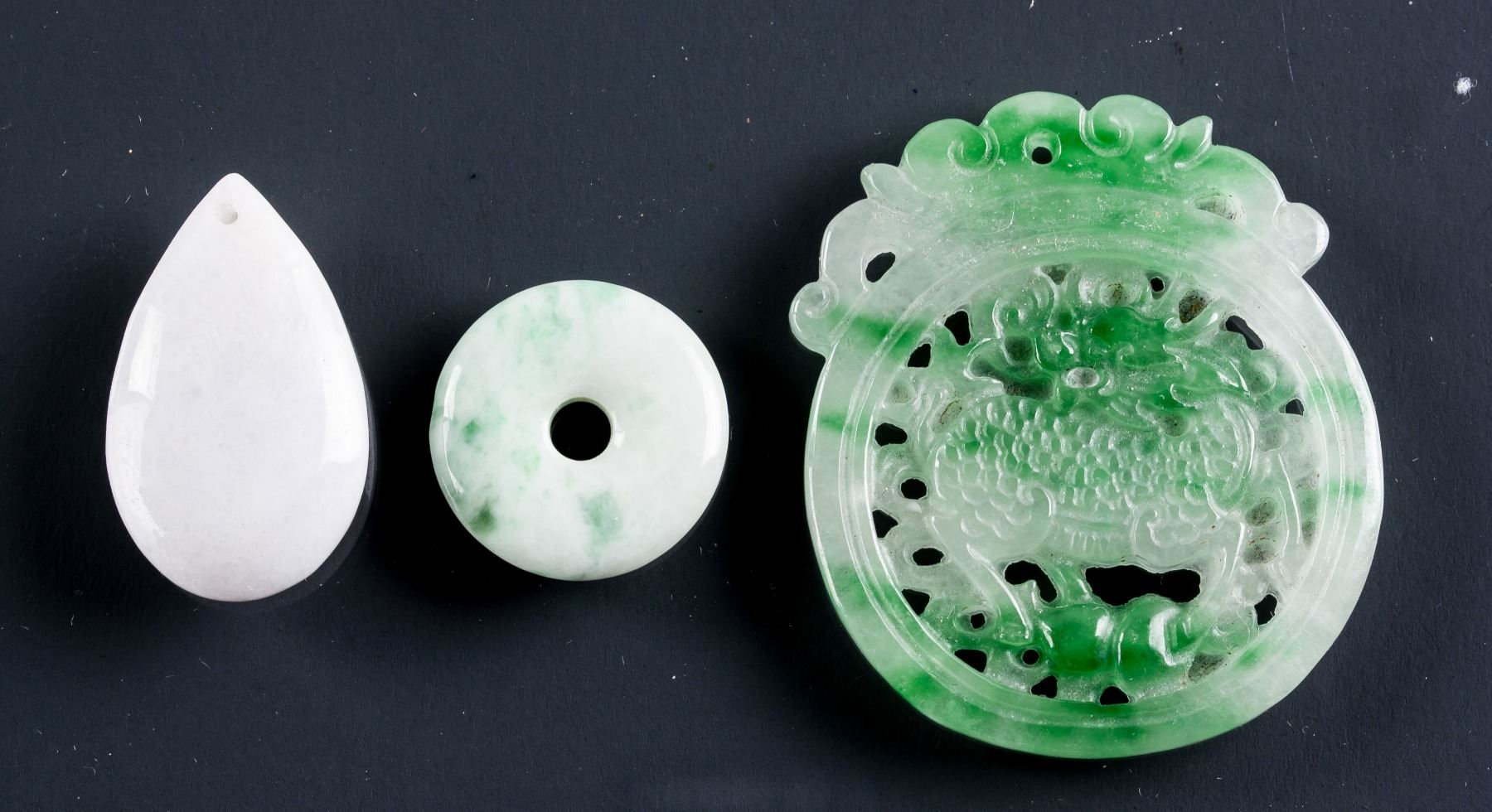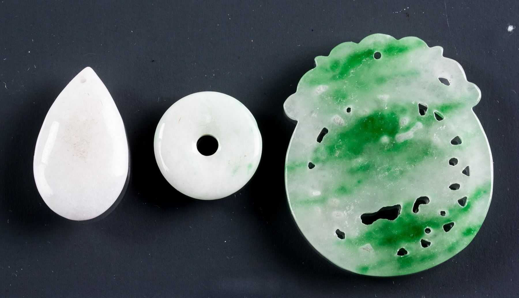 3 assorted Burma jadeite carved pendants, one tear form, of white tone, one circle form, of pale green tone, one Kirin form, of apple green tone, all pierced for suspension, 2-5 x 2-4 cm, 36 grams total, density: 3.17, 3.27, 3.31