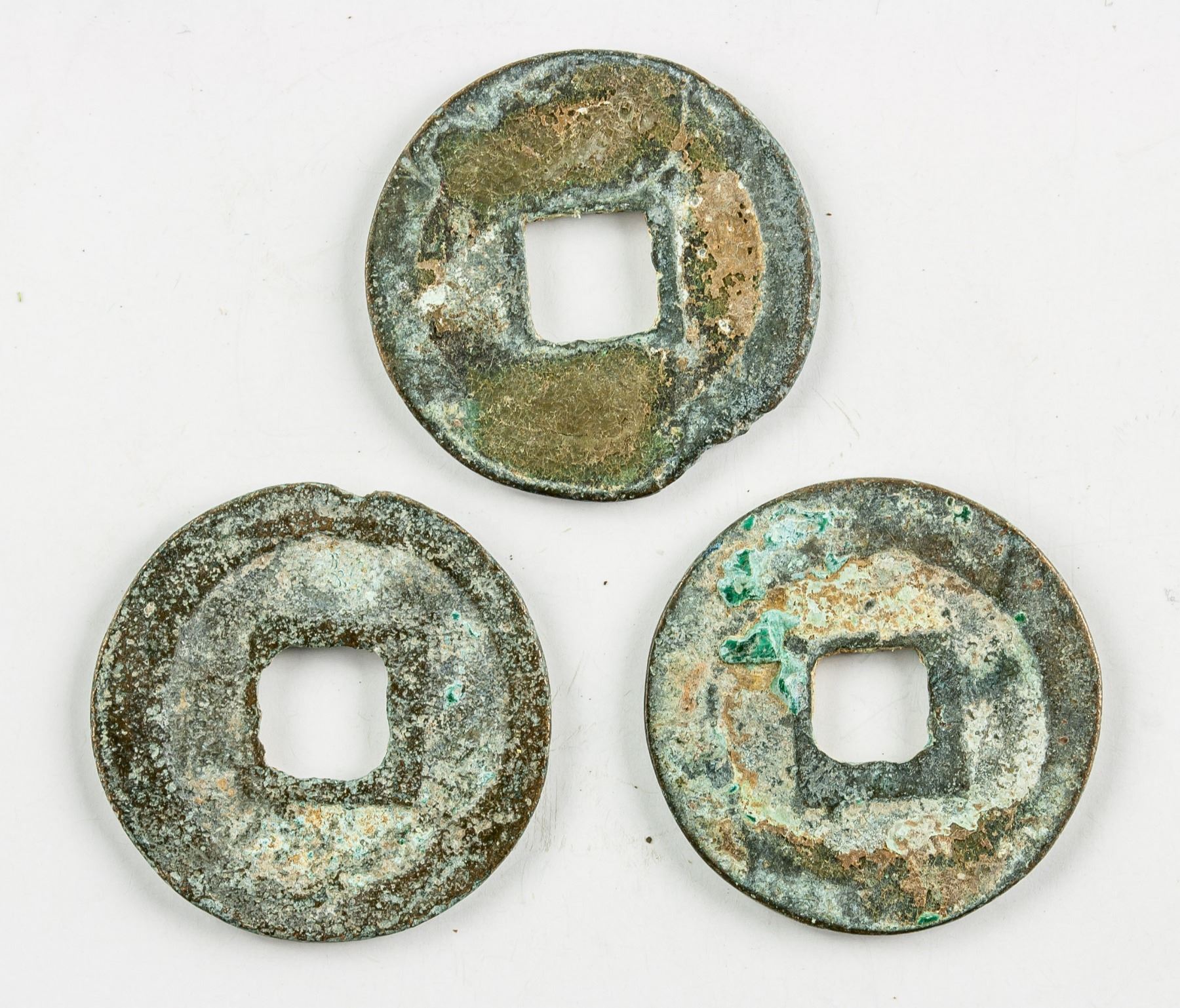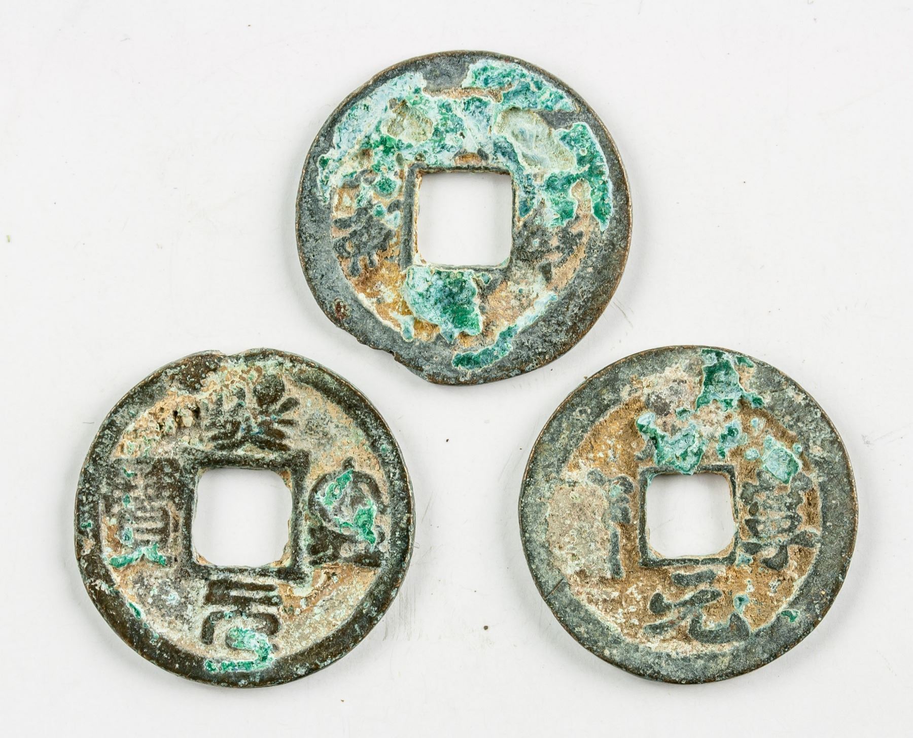 3 assorted Chinese bronze coins, two 1068-1077 Northern Song dynasty Xining Tongbao, one unrecognized, D: 24.06-24.26 mm, 11.8 grams total