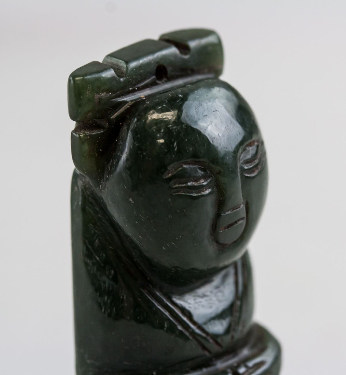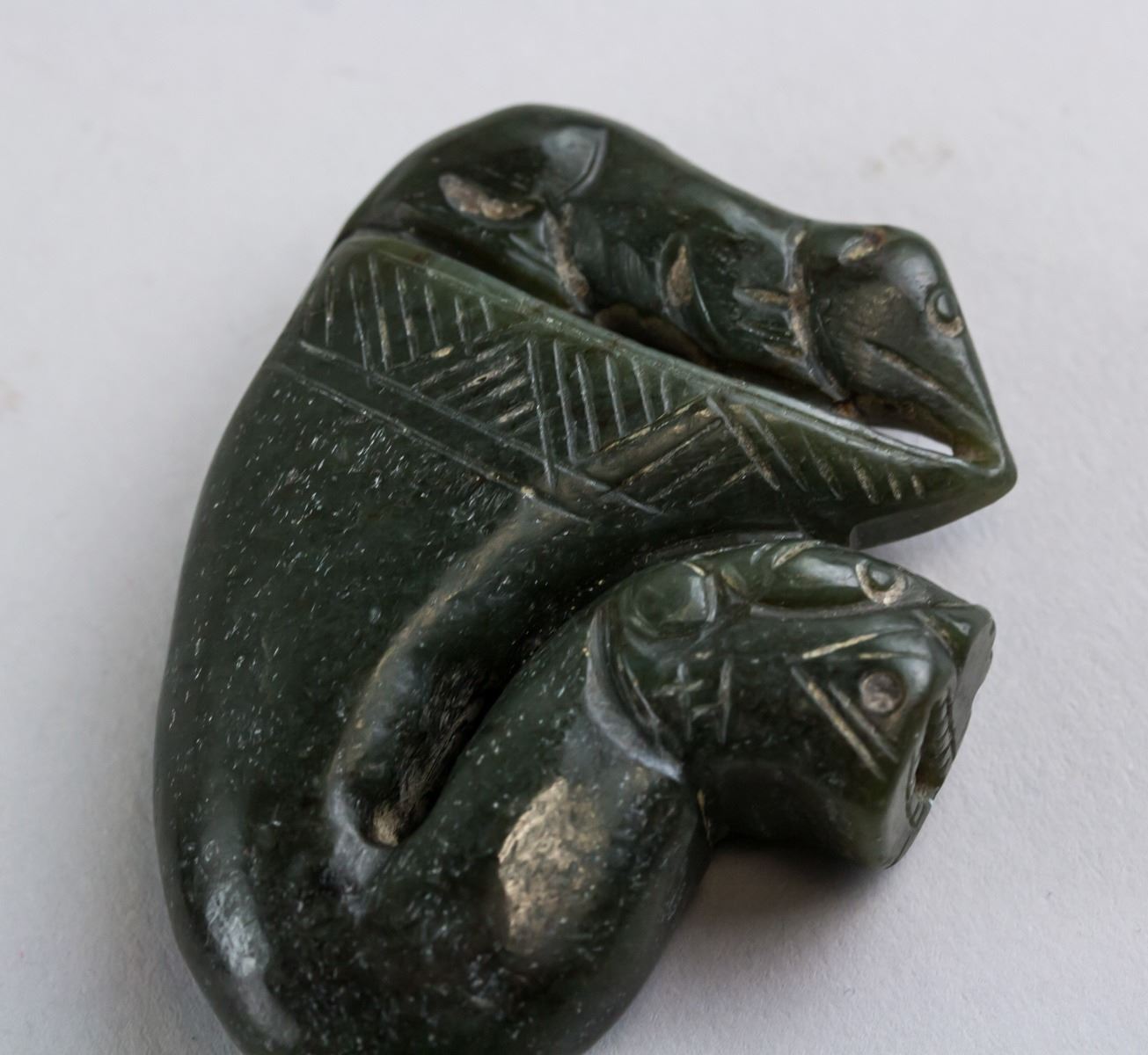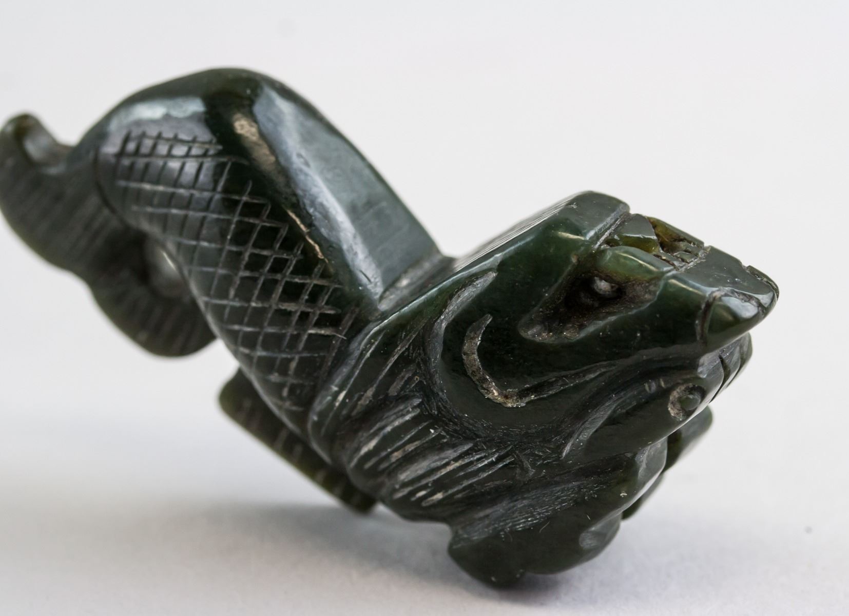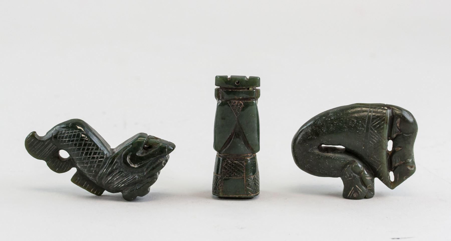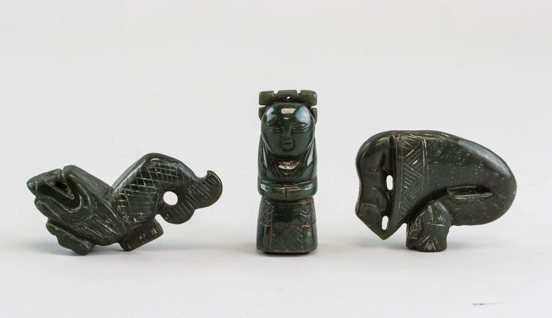 Three (3) assorted Chinese BC green jade carved toggles. Featuring Makara, figure and beast. Pierced for suspension. 5 x 6 cm, 171 grams total