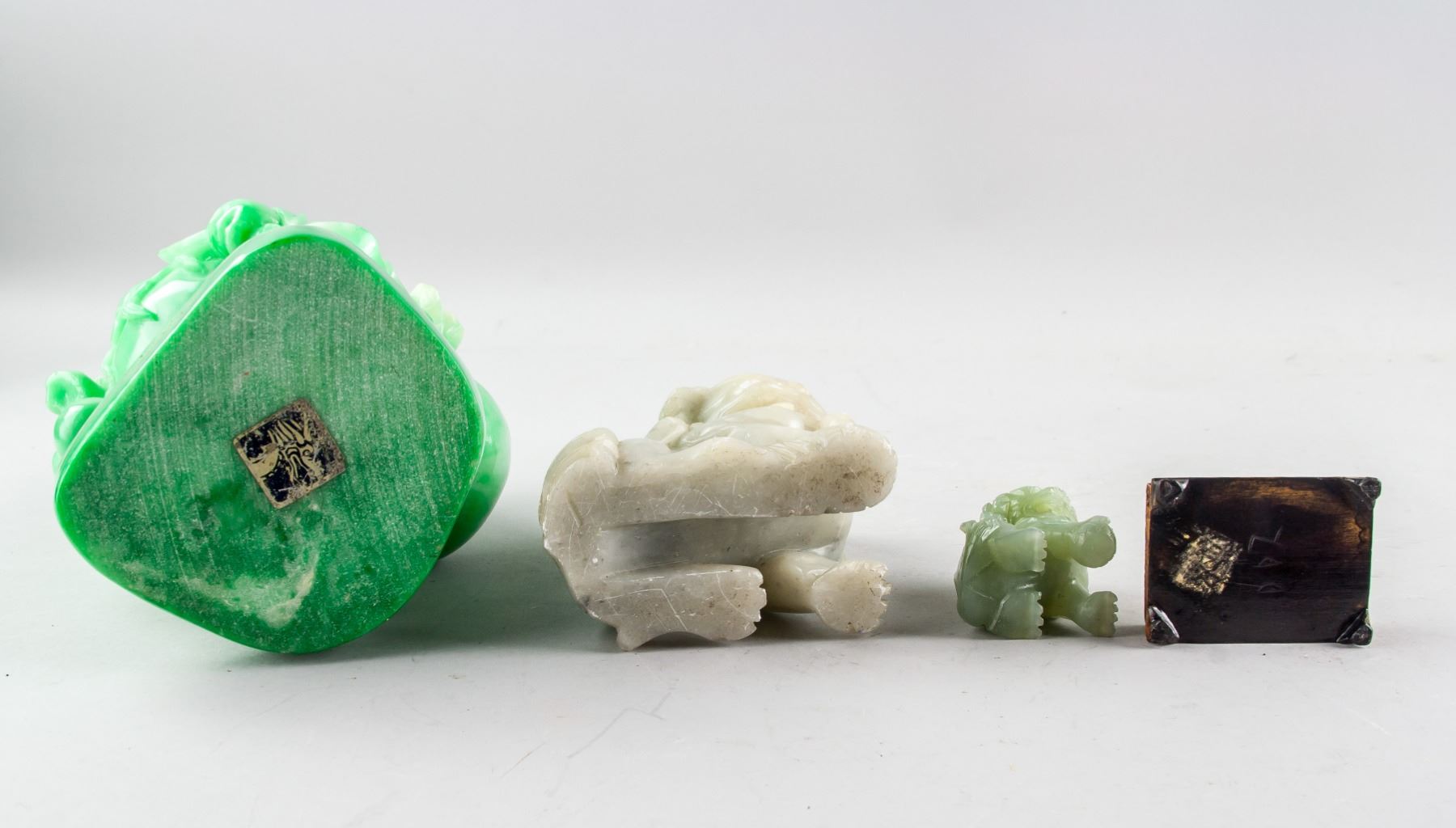 Three (3) assorted Chinese hardstone carved statues, one standing Happy Buddha, one Fu Dog, one smaller Fu Dog with wood stand, small Fu Dog 12 x 10 cm, 1007 grams