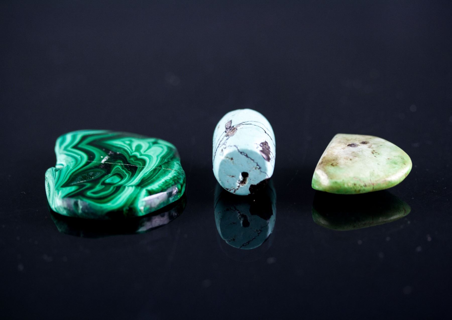 Three (3) pieces of assorted Chinese turquoise and malachite pendant; one of plate form; one of cylinder form; one of semi-sphere form; all pierced for suspension; 6 cm x 4 cm, 80 grams (3pc)