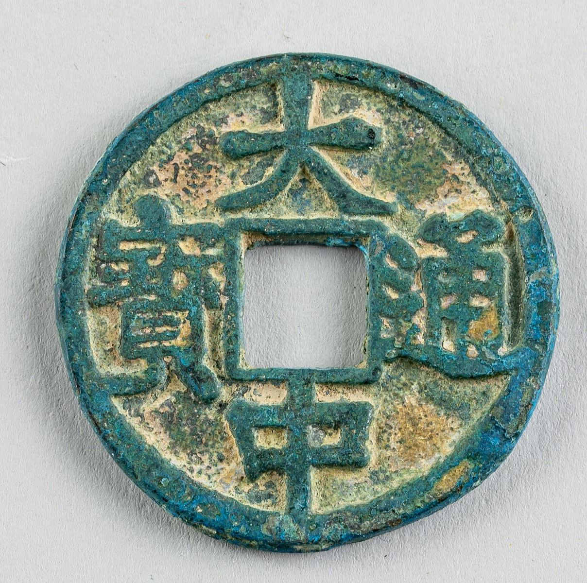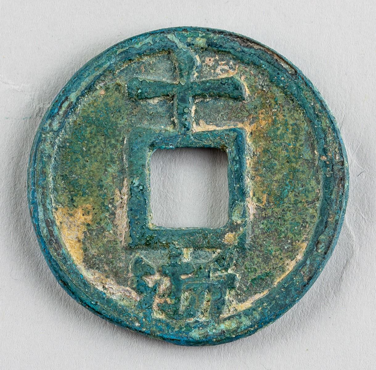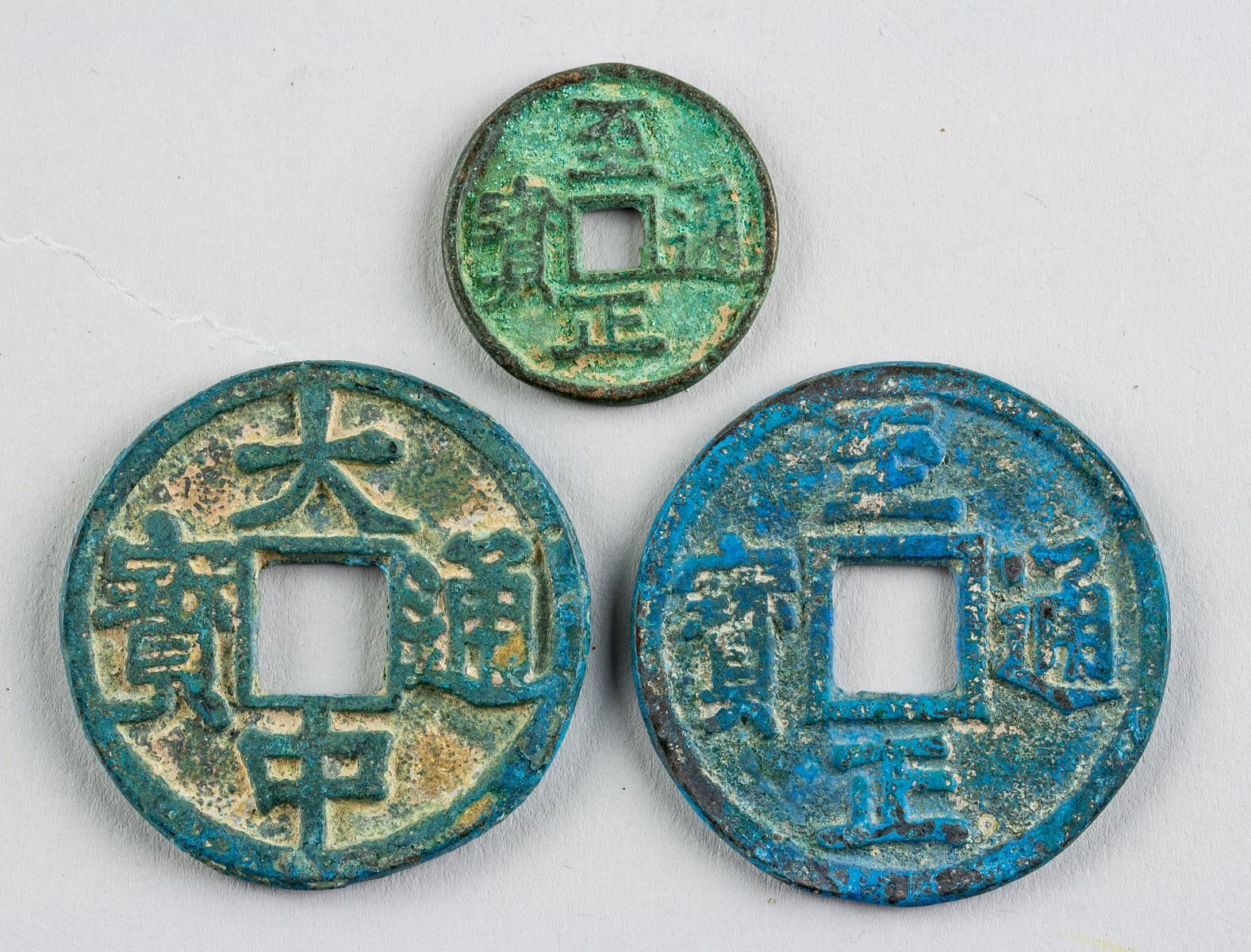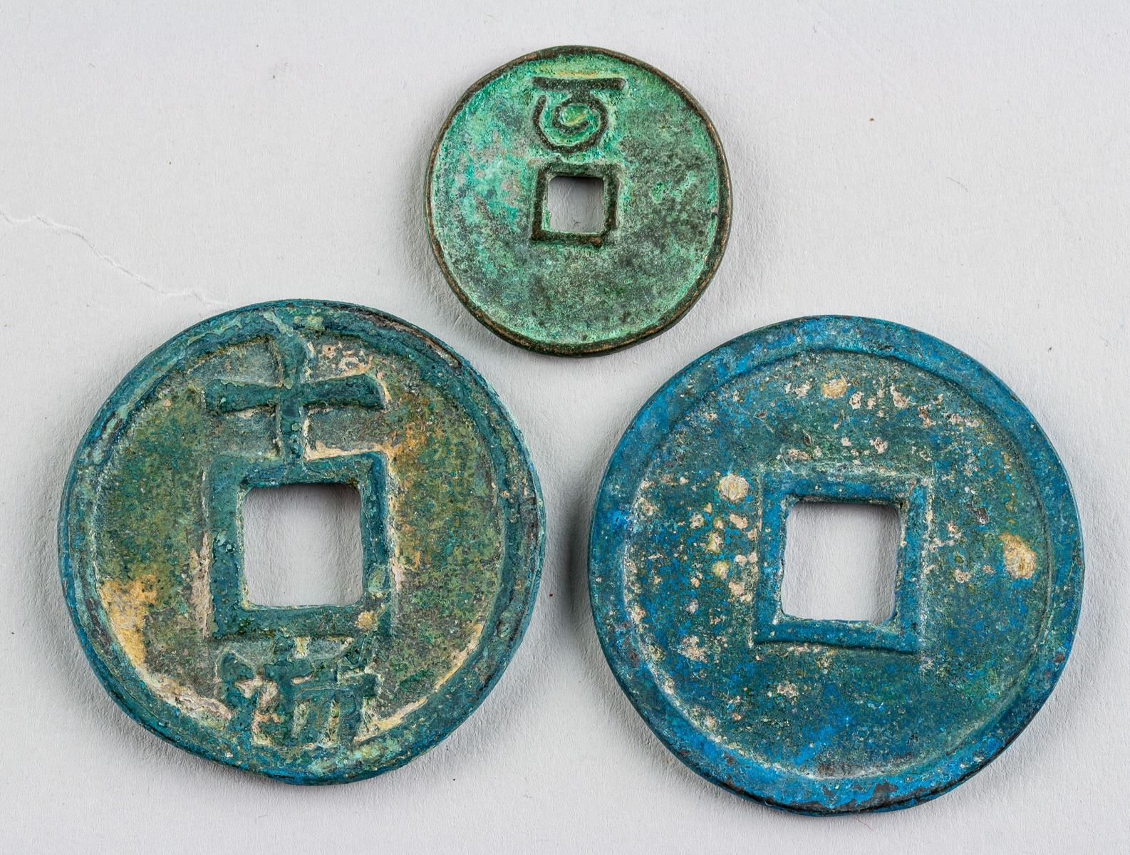 Three (3) assorted Chinese bronze coins, one (1) 1361-1368 Ming dynasty 10 Cash Dazhong Tongbao, reverse lettering Shi Zhe, Hartill 20.56, two (2) 1333-1368 Yuan dynasty Zhizheng Tongbao bronze coins, D: 2.75-4.5 cm, 53 grams total