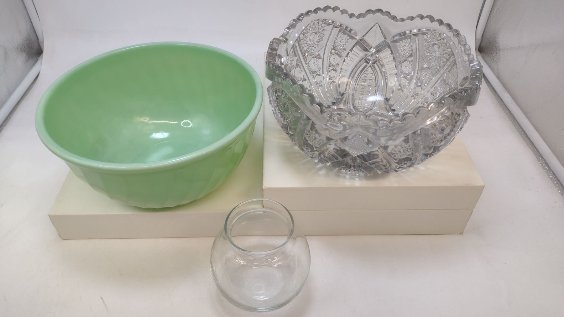 Green bowl- fire king england made, right-pinwheel glass punch bowl, front-glass vase