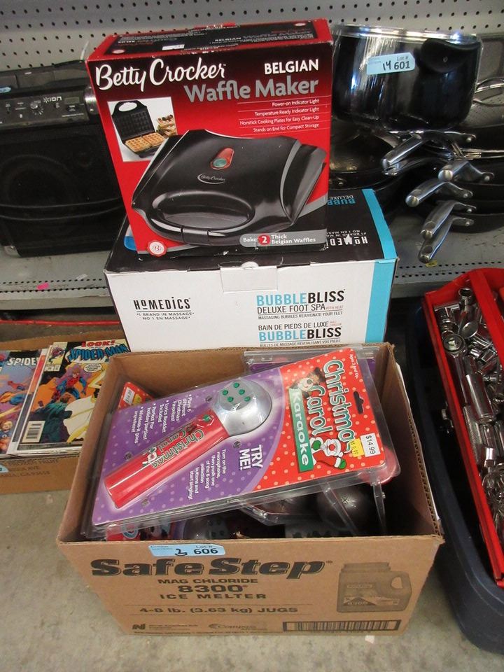 Store Returns. Waffle maker, foot spa & box of karaoke microphones.