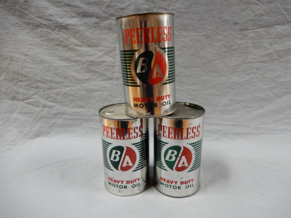 3 B/A PEERLESS HEAVY DUTY IMP. QT. OIL CANS ONE IS FULL- EMOBSSED TOPS- SOME WEAR LOCATION: UPPER RIGHT