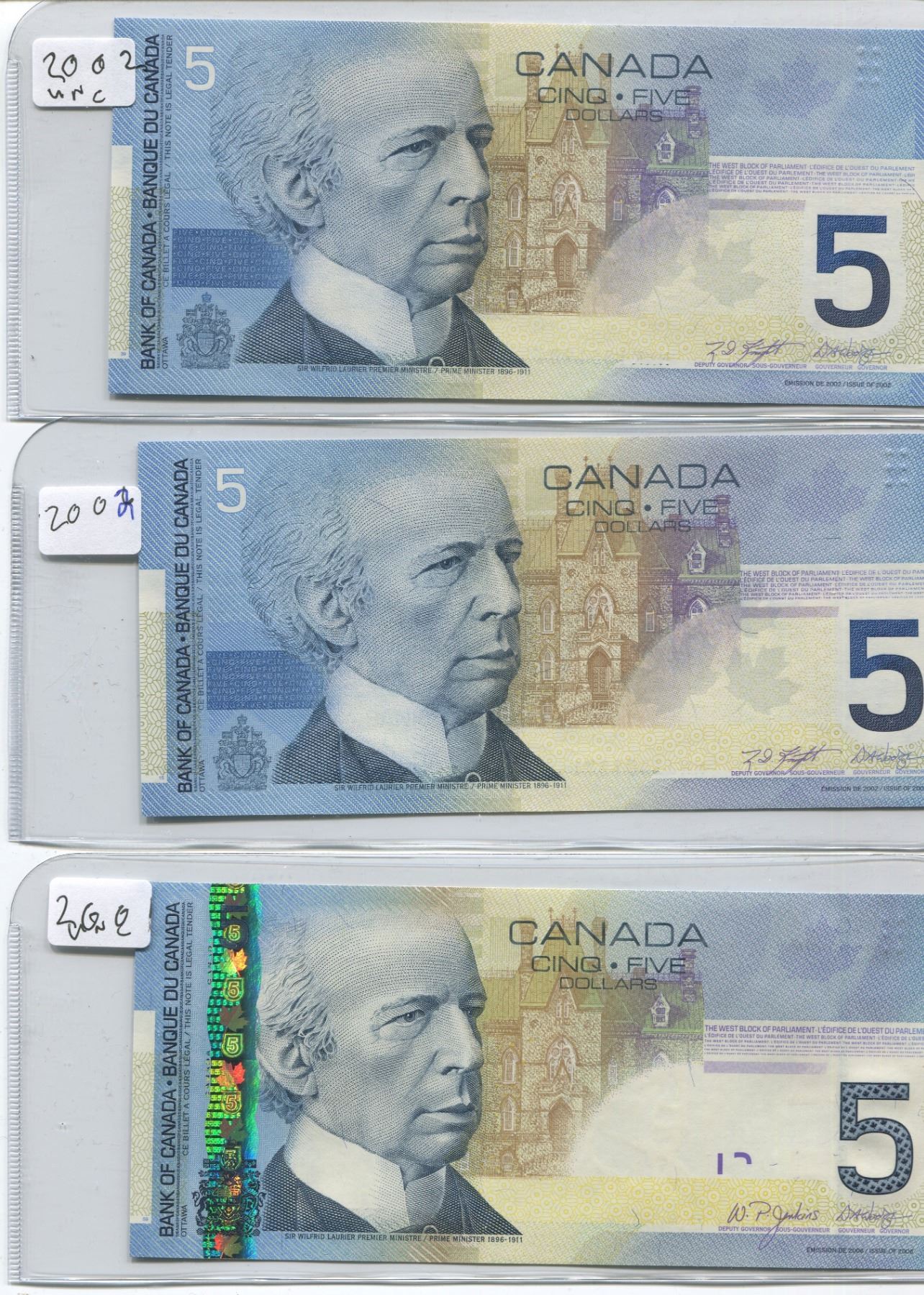 (3) BANK OF CANADA FIVE DOLLAR BILLS (2) 2002, 2006