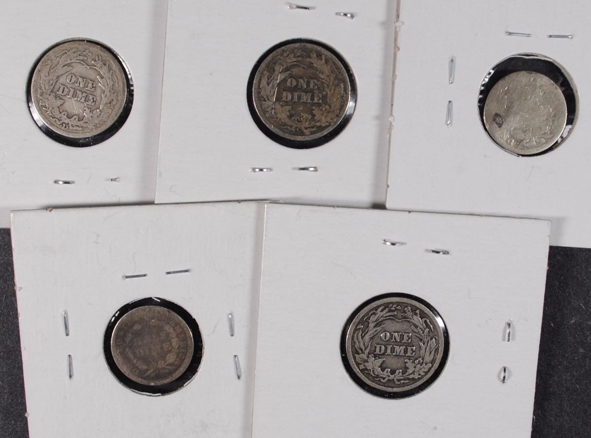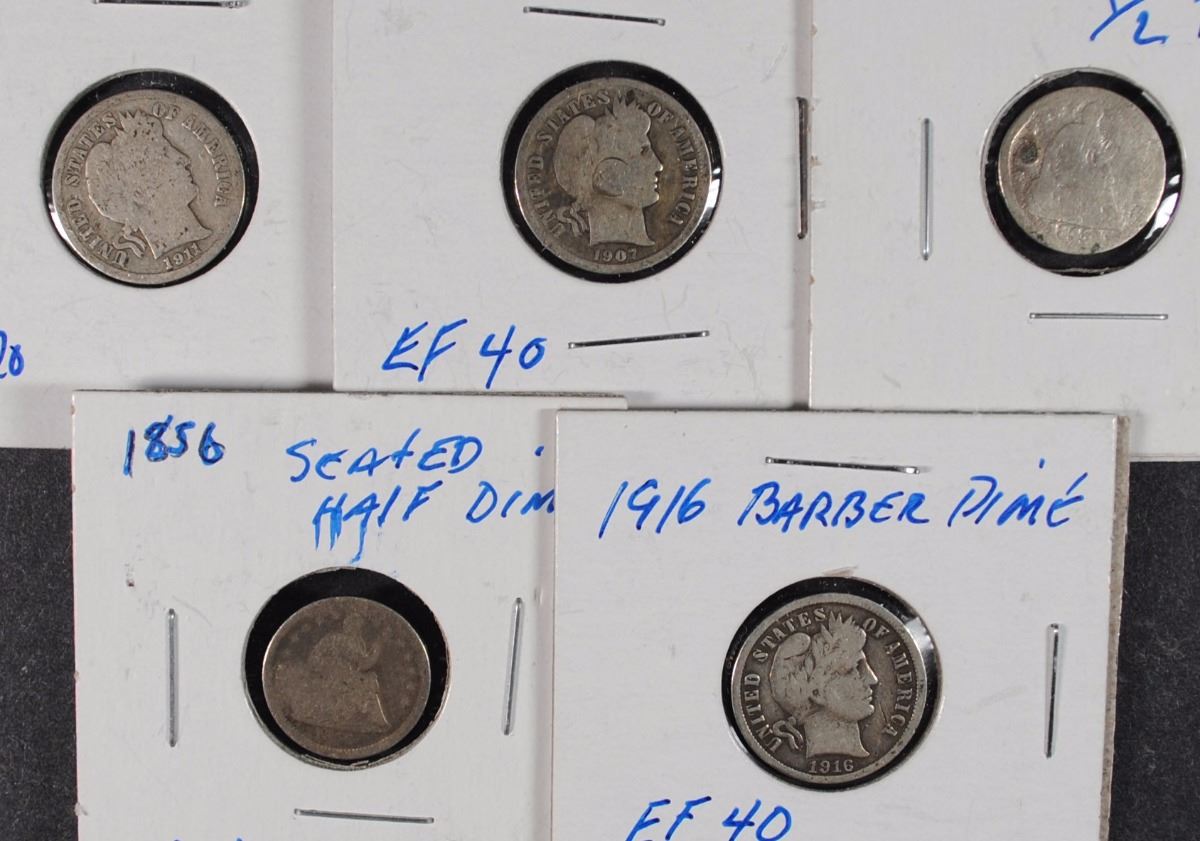 3 - BARBER DIMES GOOD/VG 1907, 1911-D, 1916; 1845 & 1856 SEATED DIME GOOD/AG