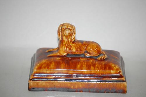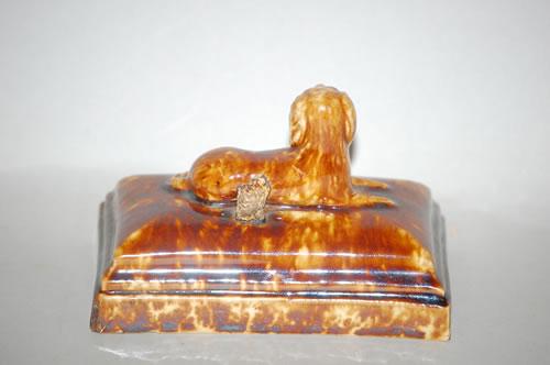 3" BENNINGTON SPANIEL TOP PAPERWEIGHT - FLINT GLAZE ENAMEL BENNINGTON PAPERWEIGHT W/ SPANIEL IN MOTTLED BROWN GLAZE-LYMAN FENTON 1849 MARK ON BASE (3" T X 4 1/2" W) - WEAR, BASE CHIPS, FACE REPAIR, IMPERFECTIONS