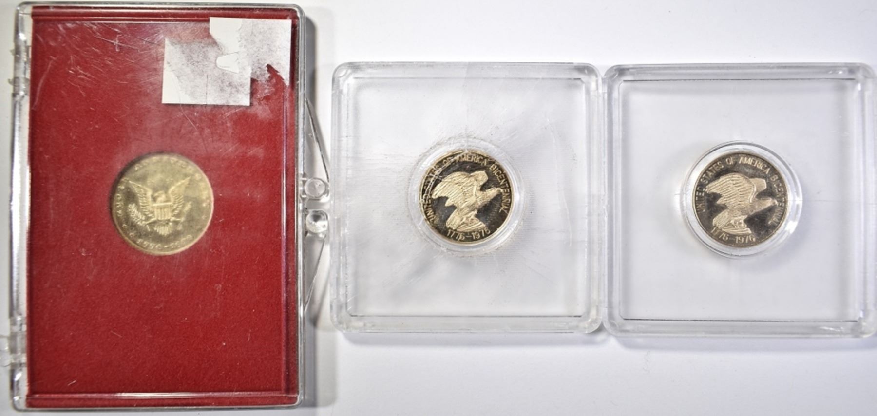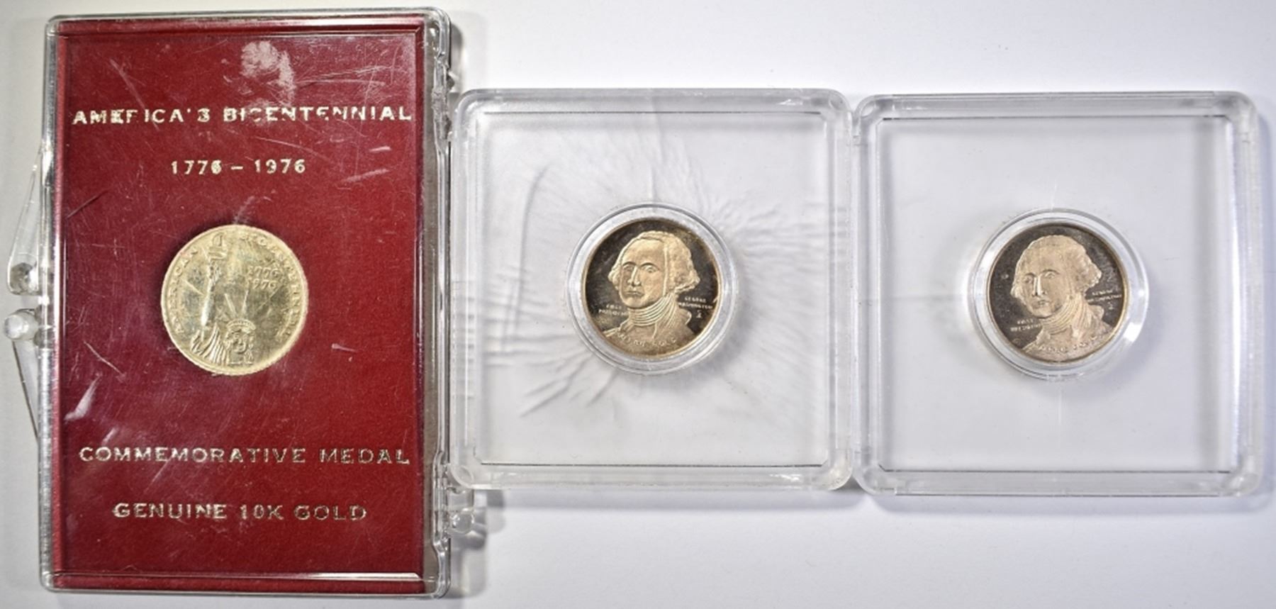 2 WASHINGTON .500 FINE GOLD 2.4 GRAMS EACH, 1 LIBERTY 10K GOLD 1.5 GRAM. BID WITH SILVER CITY AUCTIONS. ESTIMATE $150 - $200.