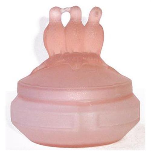 This lovely figural powder jar features a lid with a striking Art Deco design with three birds sitting on a branch, two facing each other with their beaks touching, one looking straight ahead. Whitmyer shows the jar on pg 15 of - Bedroom & Bathroom Glassware of the Depression Years. This piece was produced in lovely pink satin or frosted glass and beautifully executed with fine definition to all the features. The jar measures about 5 1/2 inches tall x 4 1/4 inches across the base and is in excellent condition