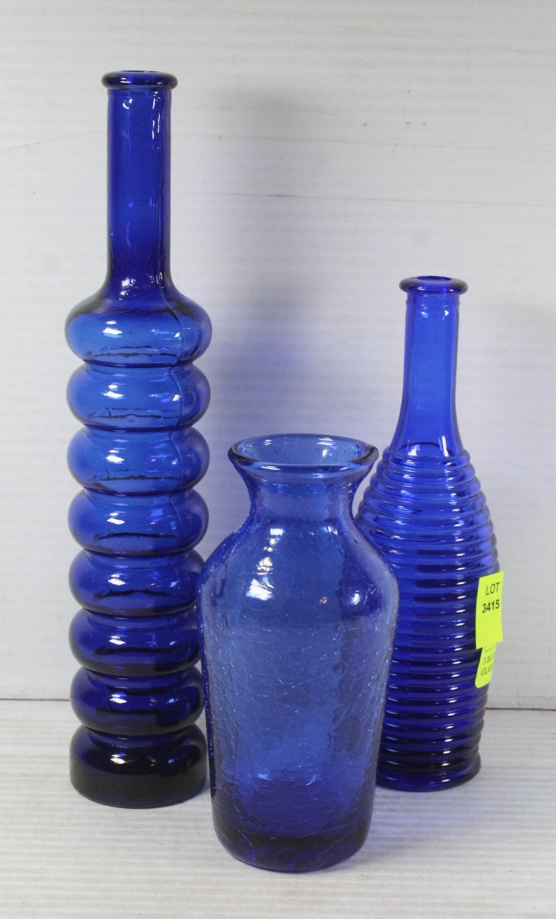 3 BLUE BOTTLES ONE CRACKLE GLASS