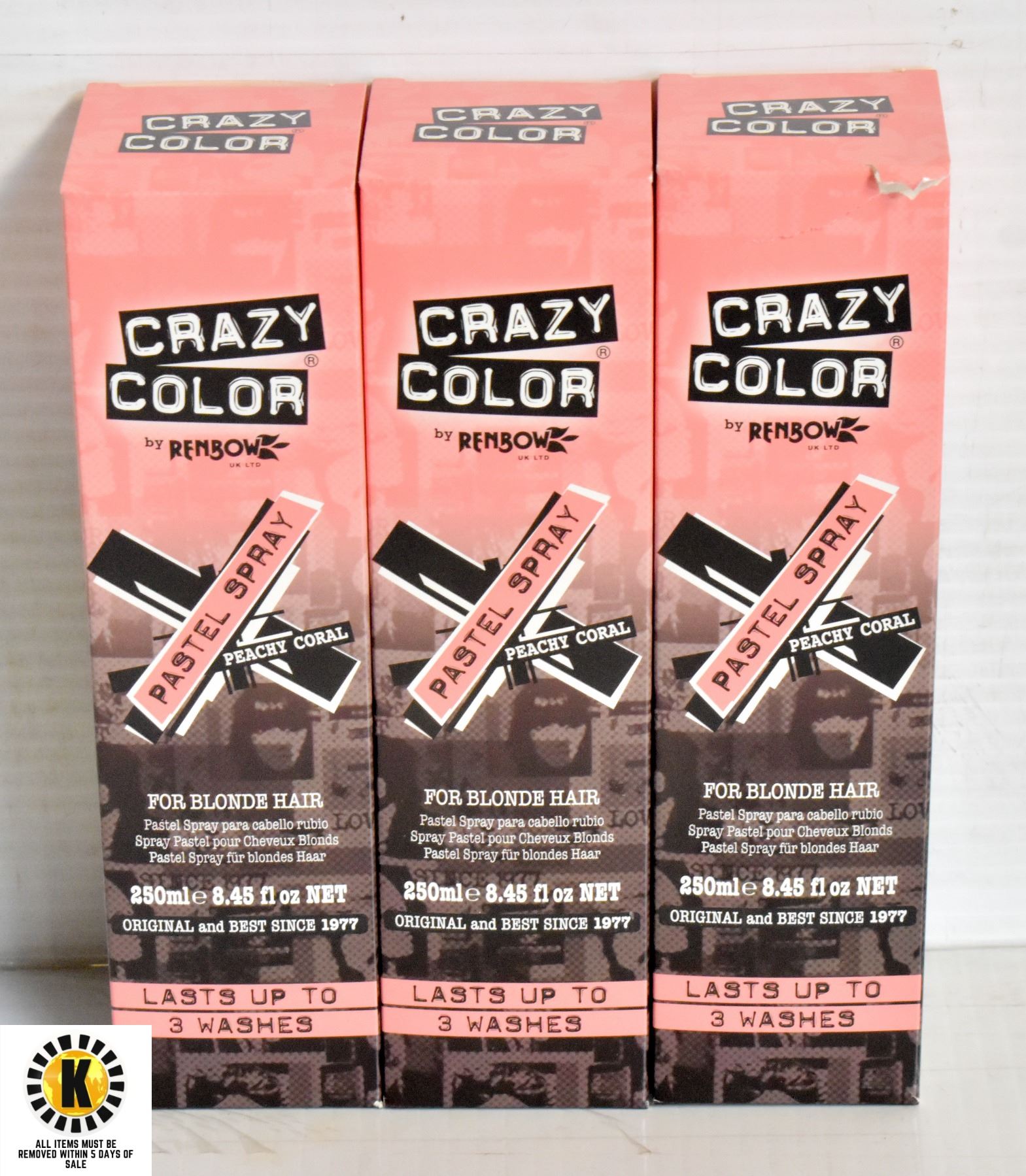 3 BOTTLES OF 250 mL PEACHY CORAL CRAZY COLOR PASTEL SPRAY TEMPORARY HAIR COLOR FOR BLONDE HAIR exp 02/18