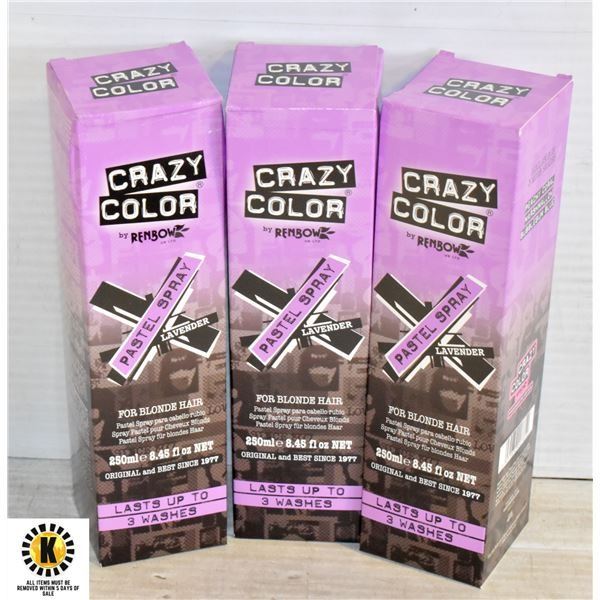 3 BOTTLES OF 250 mL LAVENDER CRAZY COLOR PASTEL SPRAY TEMPORARY HAIR COLOR FOR BLONDE HAIR **SHIPPING NOT AVAILABLE** **ALL ITEMS MUST BE REMOVED BY 5PM MONDAY, OCTOBER 31, 2022. ALL REMAINING ITEMS WILL BE SUBJECT TO A $6.00 PER DAY STORAGE CHARGE. ANY ITEMS REMAINING AFTER MONDAY, NOVEMBER 21, 2022 WILL BE CONSIDERED FORFEITED. NO REFUNDS WILL BE ISSUED FOR FORFEITED ITEMS. TO SCHEDULE A PICK UP APPOINTMENT CLICK HERE