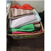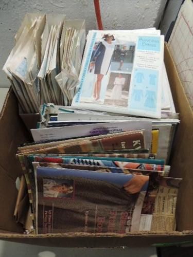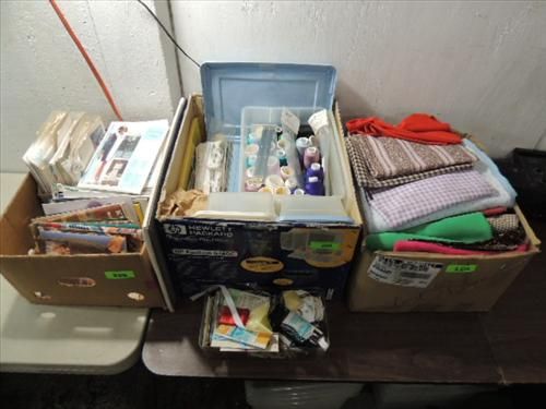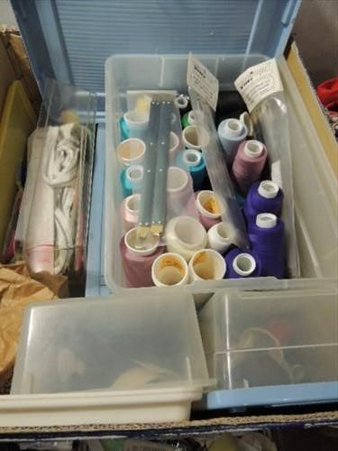 LOT 7 TUBS ASSORTED SEWING SUPPLIES: ZIPPERS, VARIETY OF LARGE SPOOL THREAD, SHOULD PADS, LACE RIBBONS, ASSORTED SEWING MATERIAL STYLES, COLOR AND FABRIC TYPE, SEWING STEP-BY-STEP PATTERNS & SEWING REFERENCE MAGAZINES - HOW TO BOOKS AND MUCH MORE. AS SHOWN. VIEW PICTURE OFR DETAIL.