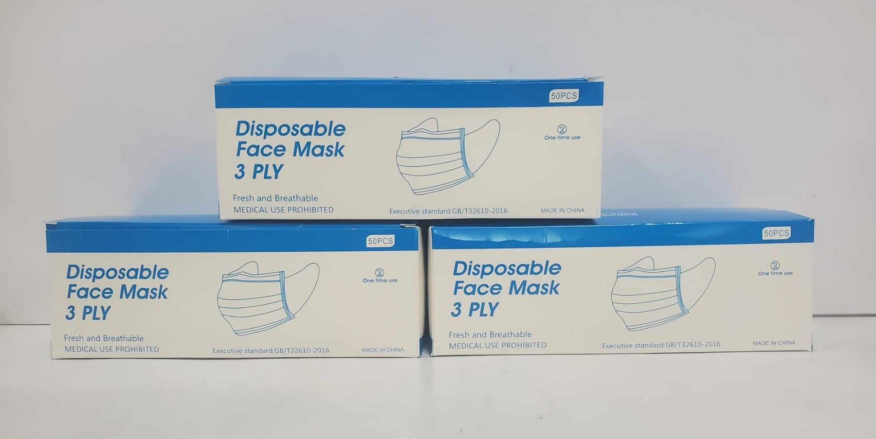 3 BOXES OF 3-PLY DISPOSIBLE FACE MASKS 50 PER BOX