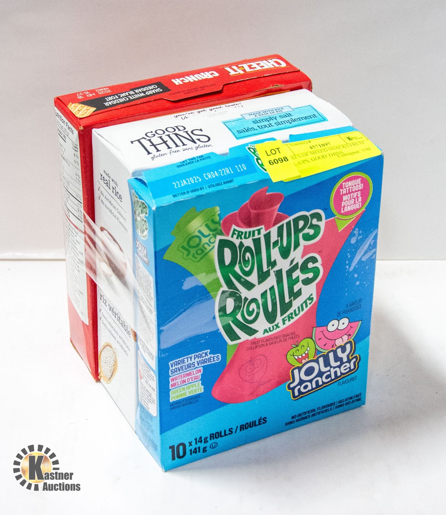 3 BOXES OF MIXED SNACKS FRUIT ROLL-UPS, GOOD THINS
