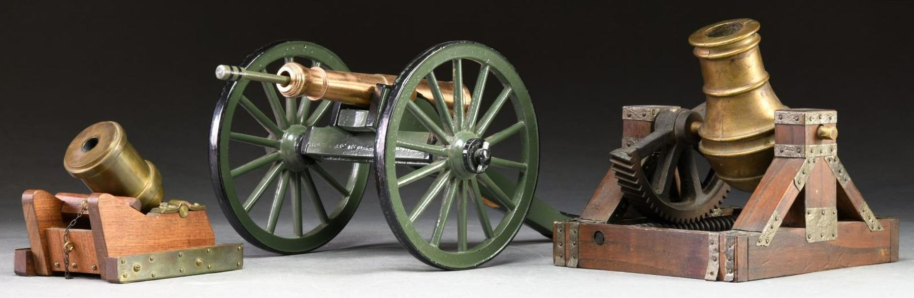 Lot consists of: 1) Unmarked brass cannon on a cast and painted aluminum carriage. Carriage cap squares are painted and are not removable. Cannon measures 8 1/4" in length. Carriage measures 12 1/2" in length and 9" in width. Complete w/ a matching painted bore brush. This is a non-firing display piece. CONDITION: very good w/ mild wear to paint and some discoloration to cannon tube. 2) Unmarked brass mortar on fixed wood mounted w/ brass accoutrements. Mortar measures 3 1/4" in length. Base measures 4 1/8" wide and 5" long. Complete w/ chained base wedge. CONDITION: brass components exhibit pleasing patinas overall w/ some discoloration around the touch hole. Wood base is very good. 3) Non-firing replica of Leonardo Da Vinci's 1483 Bombarda. Cast cannon tube & adjustment crank w/ steel fire adjustment mechanism. Wood base w/ thin metal bands retained by tapped pins. CONDITION: cannon exhibits areas of discoloration & patina, but otherwise presents nicely overall. Wood base shows some light wear & loosening to the metal bands, but otherwise remains sturdy & serviceable. PROVENANCE: from the Lifelong Collection of Glen E. Mattox. (02-18950/MLW). $200-300.