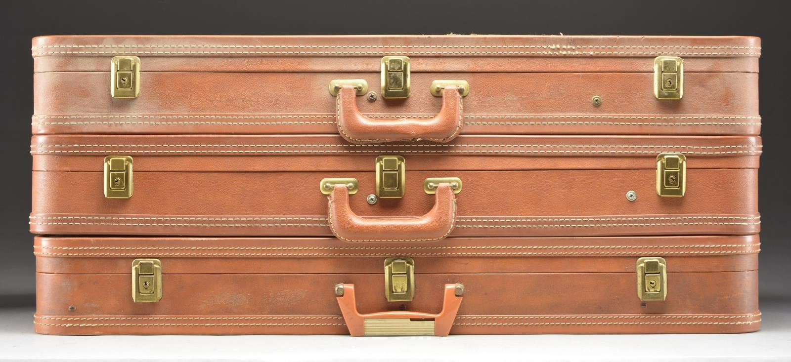 32" X 10" X 5" Brown leather luggage case w/ felt interior appearing. Able to fit 30" bbls. 1) HARTMANN CASE FOR O/U SHOTGUN. Comes w/ key. CONDITION: while case appears intact, exterior has black residue throughout. 2) CASE FOR O/U SHOTGUN. Comes w/ key & hang tag. CONDITION: very good overall w/ light residue. 3) CASE FOR BSS SHOTGUN. CONDITION: while case can lock, fair overall w/ cracking of leather on handle & lid. (02-19742-2/MD). $400-600.