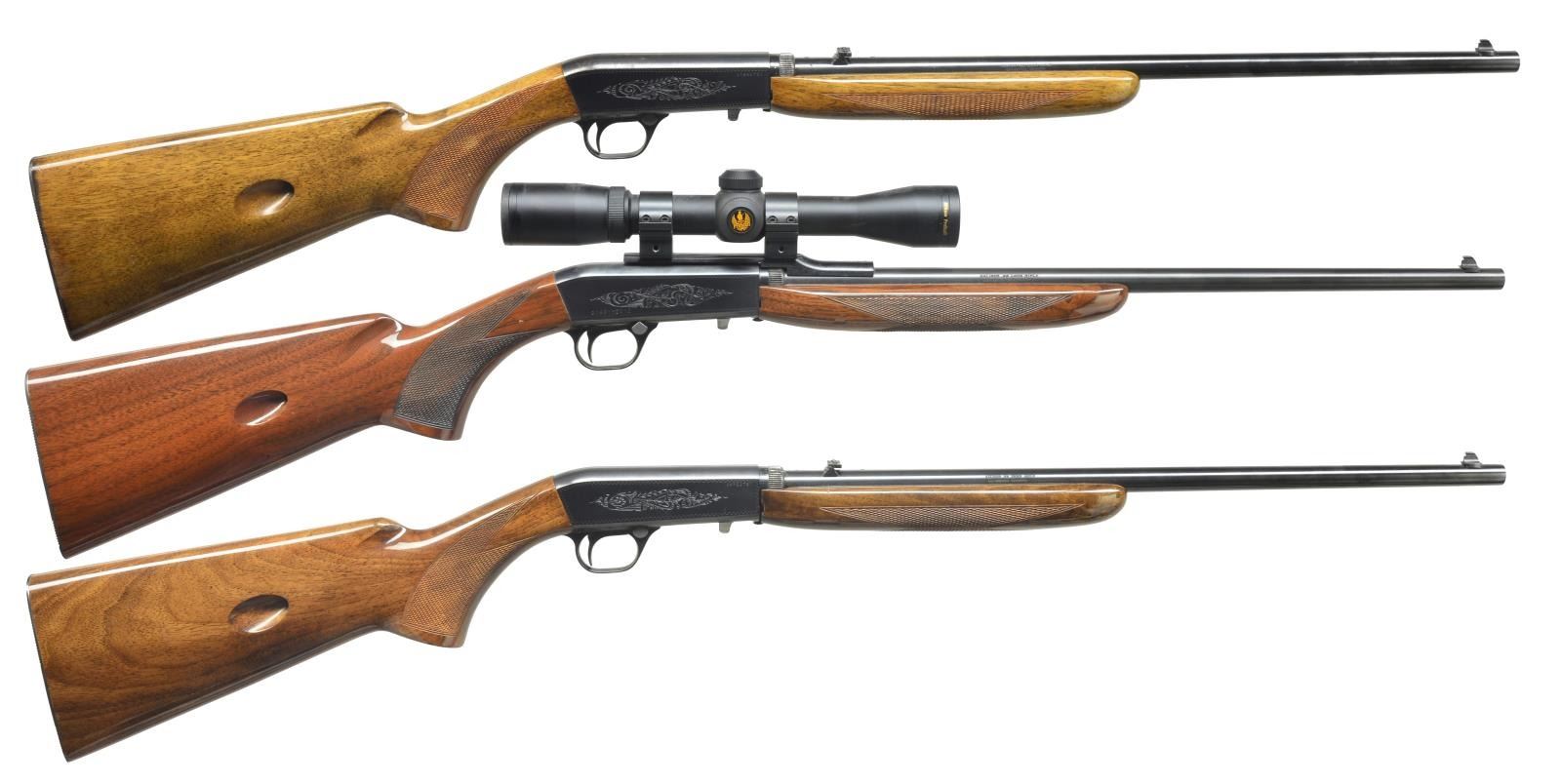 JAPAN. 1) AUTO 22. Cal. 22 LR. S# 07995T57. Bbl. 19 1/2" w/ flip up rear sight & bead front. Marked w/ Browning address, cal. & "MADE IN JAPAN". Blued action has scroll engraving on sides w/in zig-zag borders. Pistol grip stock w/ tubular mag. & loading port through right side. Has point pattern checking at grip. Matching full forend holds take-down latch. CONDITION: fine, metal parts show some edge wear & scattered marks. Also scattered marks on original varnish on stocks. Firing pin is broken. Bright shiny bore. (20-3559/MGM). MODERN. $300-450. 2) GRADE ONE BROWNING 22 AUTO W/ SCOPE. Cal. 22 LR. S# 01931MZ212. Bbl. 19" in standard configuration w/ all correct marks along w/ "MADE IN JAPAN / MIROKU". Blued action has scroll engraving. Plain American walnut checkered stocks w/ tubular mag. loading through hole in right side of butt. Rifle is mounted w/ Nikon Pro-Staff scope in Weaver rings & mount. CONDITION: very fine overall w/ evidence of some use & only a few minor handling marks in all factory finishes. Bright shiny bore. Mechanically fine. (20-3561/MGM). 3) BROWNING 22 AUTO GRADE ONE. Cal. 22 LR. S# 04700T57. Bbl. 19" in standard configuration. All correct nomenclature on bbl. along w/ "MADE IN JAPAN". Blued action is scroll engraved. Relatively plain American walnut stocks are hand checkered. Tubular mag. loading port on right side of butt. CONDITION: fine overall w/ some scattered handling marks, mostly on wood & a couple of deep nocks at grip. Bbl. adj. ring shows considerable use & bbl. needs further adj. as it stands away from breech face presently. Bright bore. (20-3562/MGM). ALL MODERN. $1,000-1,400.