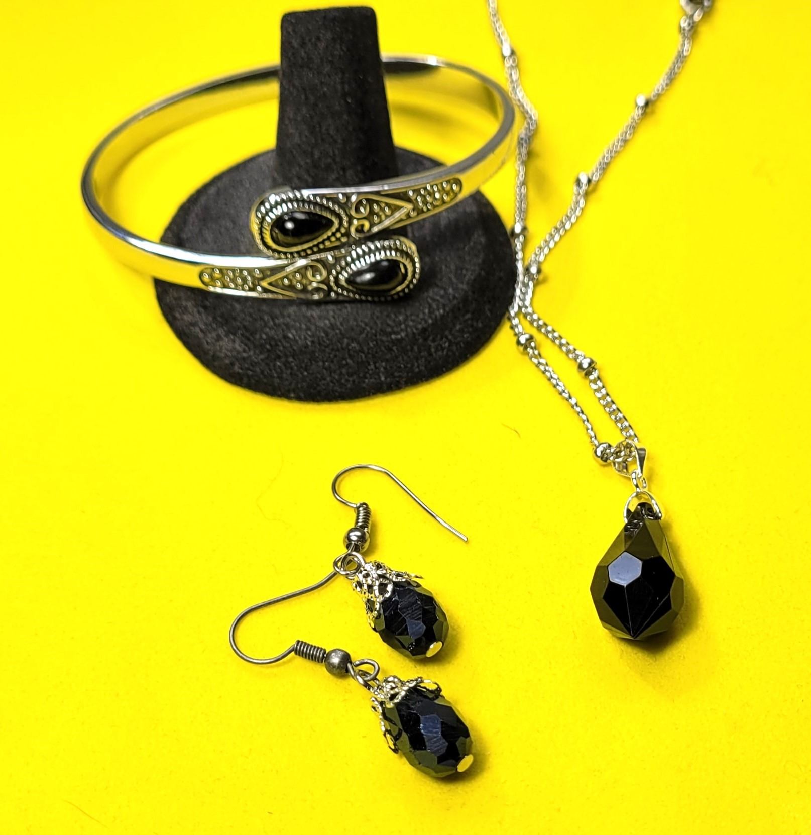 SHAPED BLACK ONYX ACCENTS AT EACH END AND BLACK SWAROVSKI CRYSTAL PENDANT ON 18" CHAIN AND MATCHING DROP EARRINGS. JEWELERY