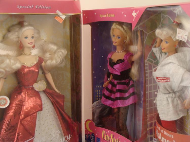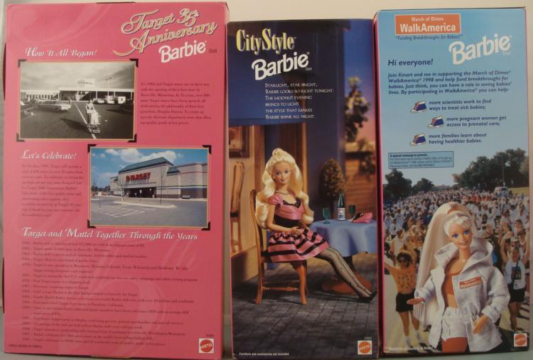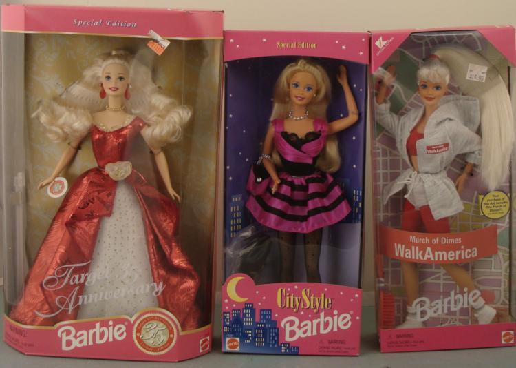 Here are 3 special edition Barbie dolls, featuring two store exclusives from 1997. One is the March of Dimes Walk America Barbie, sponsored by Kmart, all ready with walking outfit. The other store doll is Target Anniversary Barbie, wearing Target colors. Then lastly there's the City Style Barbie, in high style pink and black.