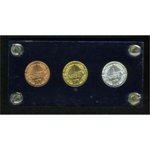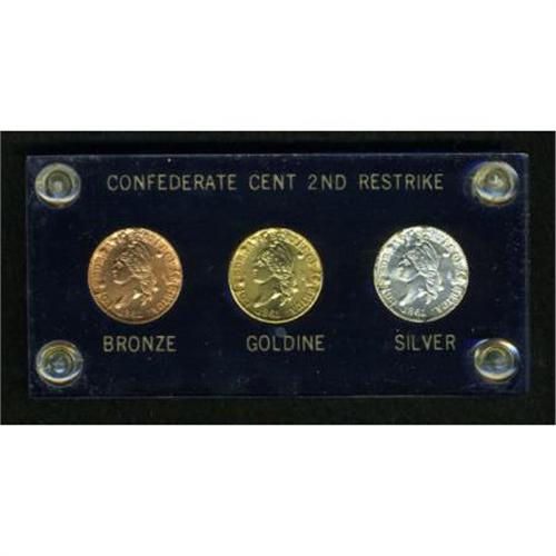 <B>Three-Piece Set of Bashlow Restrike 1861 Confederate Cents.</B></I> Struck circa 1961 by Robert Bashlow, from the canceled and broken state of the dies. The bronze (Breen-8013) has a mintage of 20,000 pieces. The goldine (Breen-8014) and silver (Breen-8011) have mintages of 5,000 pieces.<BR><BR><b>Shipping:</b> Coins & Currency (<a target="_blank" href="http://www.heritageauctions.com/common/shipping.php">view shipping information</a>)