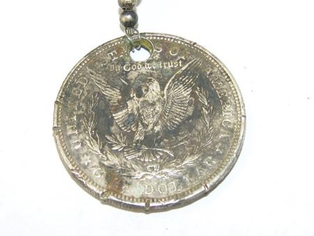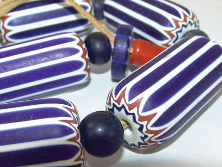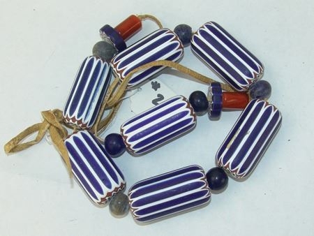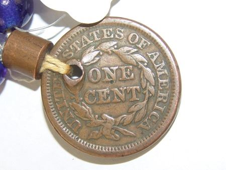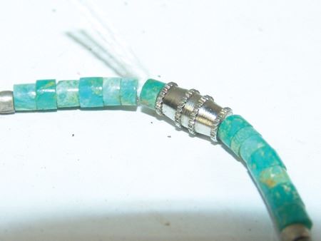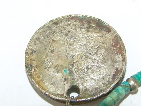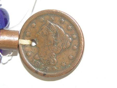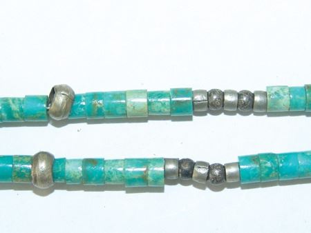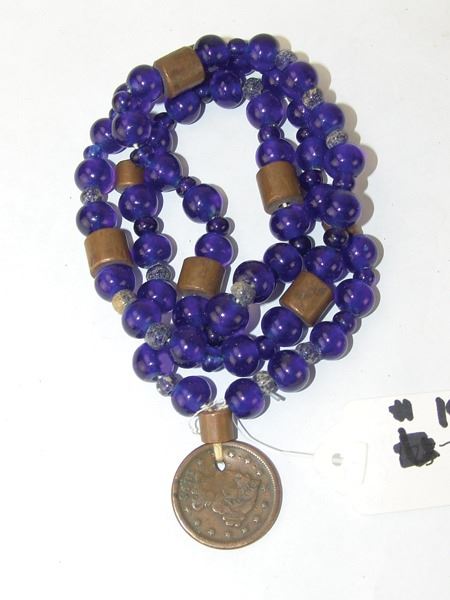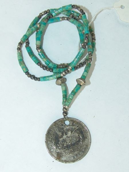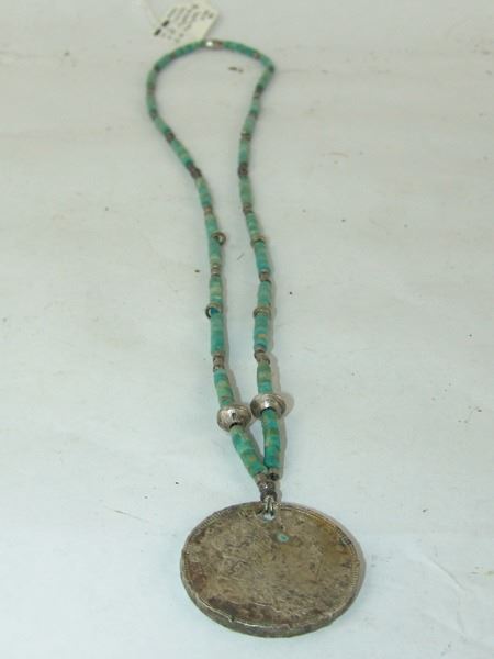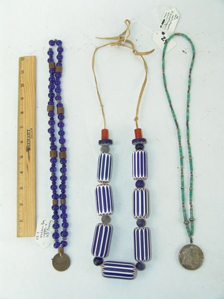 Various Ages, Including an early Hudson's Bay cobalt and copper bead necklace with large 1840 US penny, a large yellow heart and 6-layer chevron cylinder bead necklace, and a Pueblo turquoise bead necklace with coin pendant. Very good condition. 33", 28", 28"