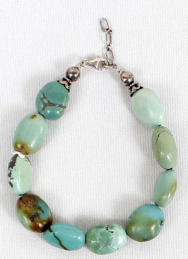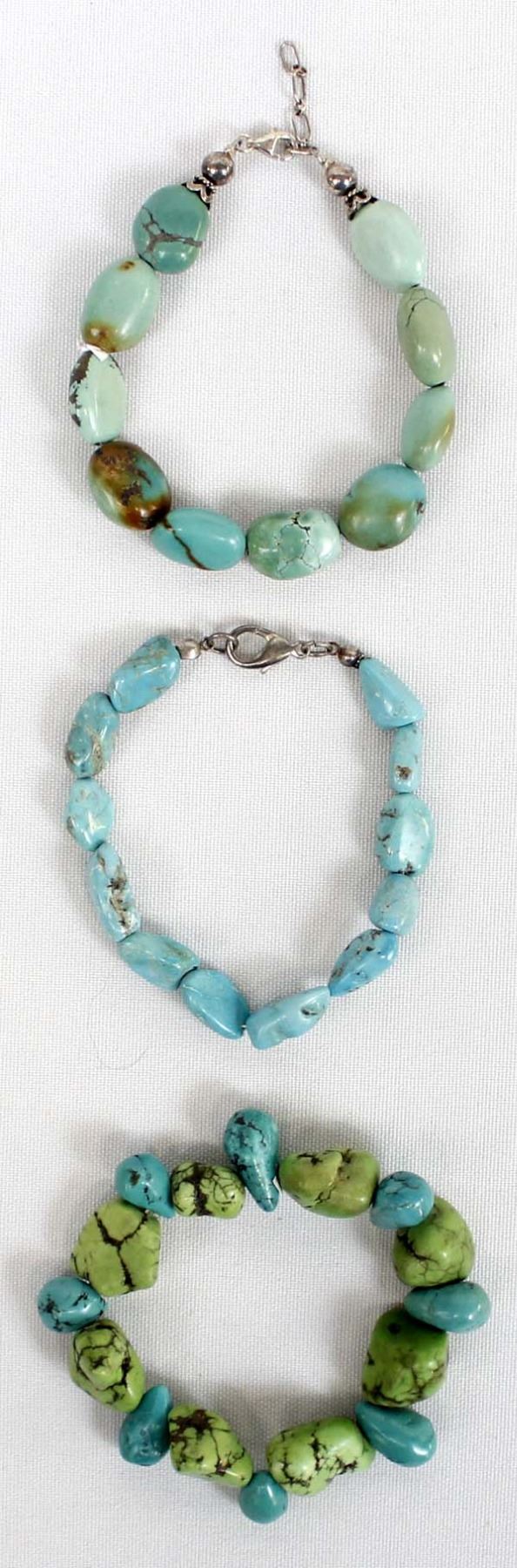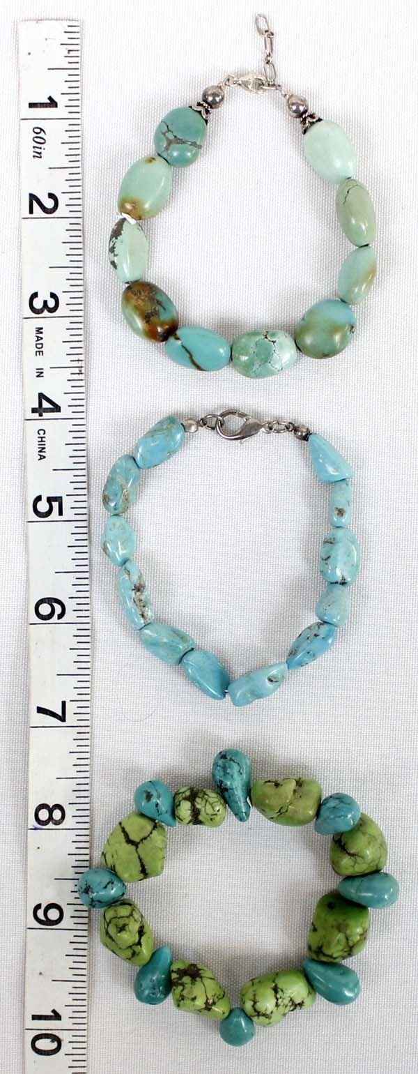 3 Beautiful Turquoise Bracelets. 1. Bisbee Blue 1. Nevada Green and 1. Morenci Turquoise . Longest is 8.5'' end to end and is adjustable, one of the bracelets is stretchable and will fit most wrist sizes