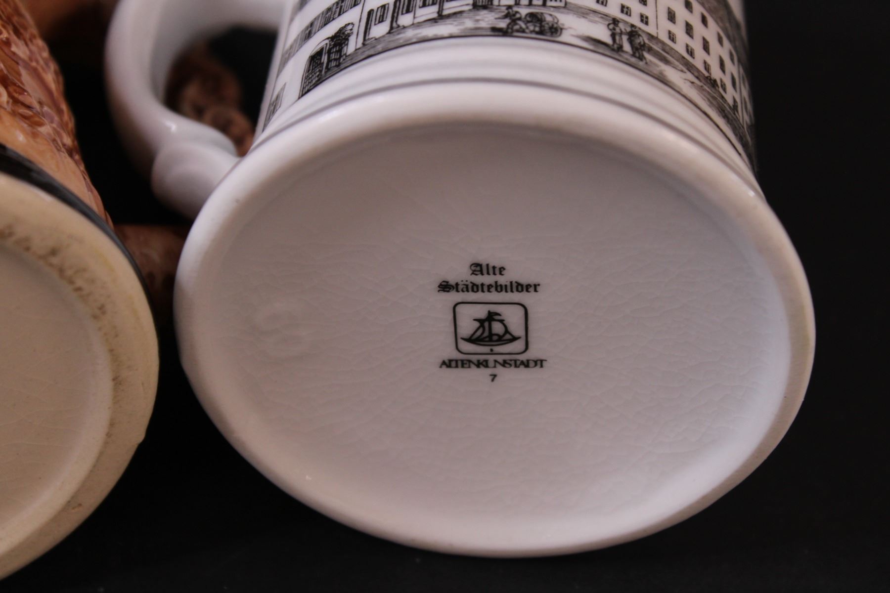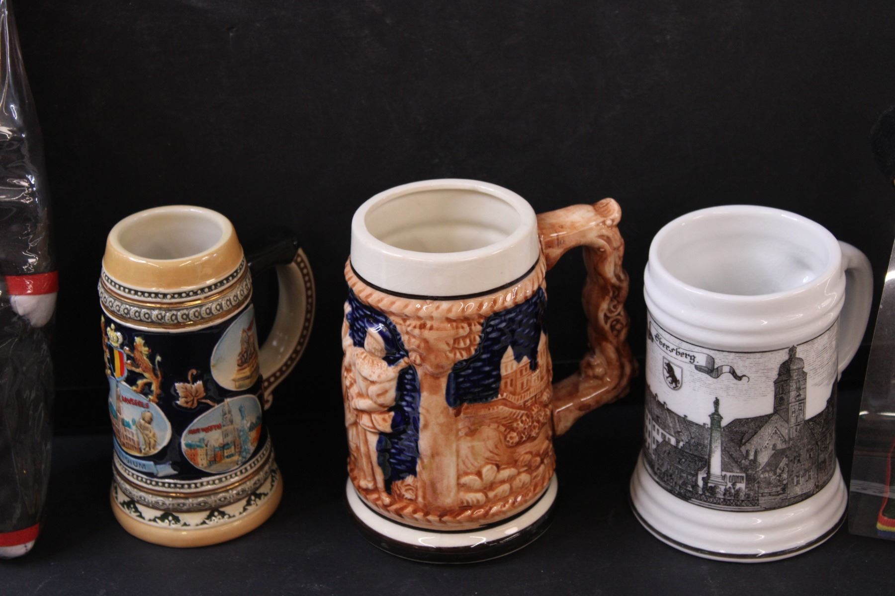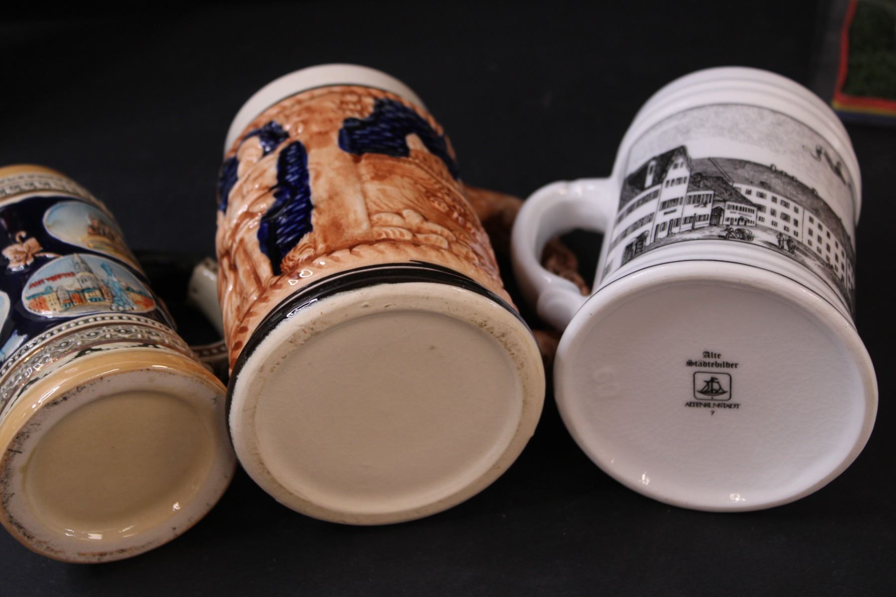 (3) Beer Steins - Assorted, (2) Romania Figurines - Various