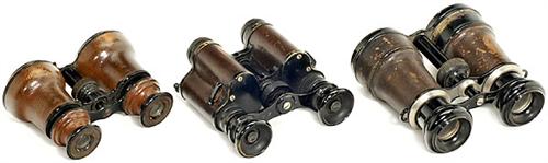 3 Binoculars Black lacquered brass binoculars with leather-covered tubes: theatre glass, field glass, prism binocular with leather bag.<Br>