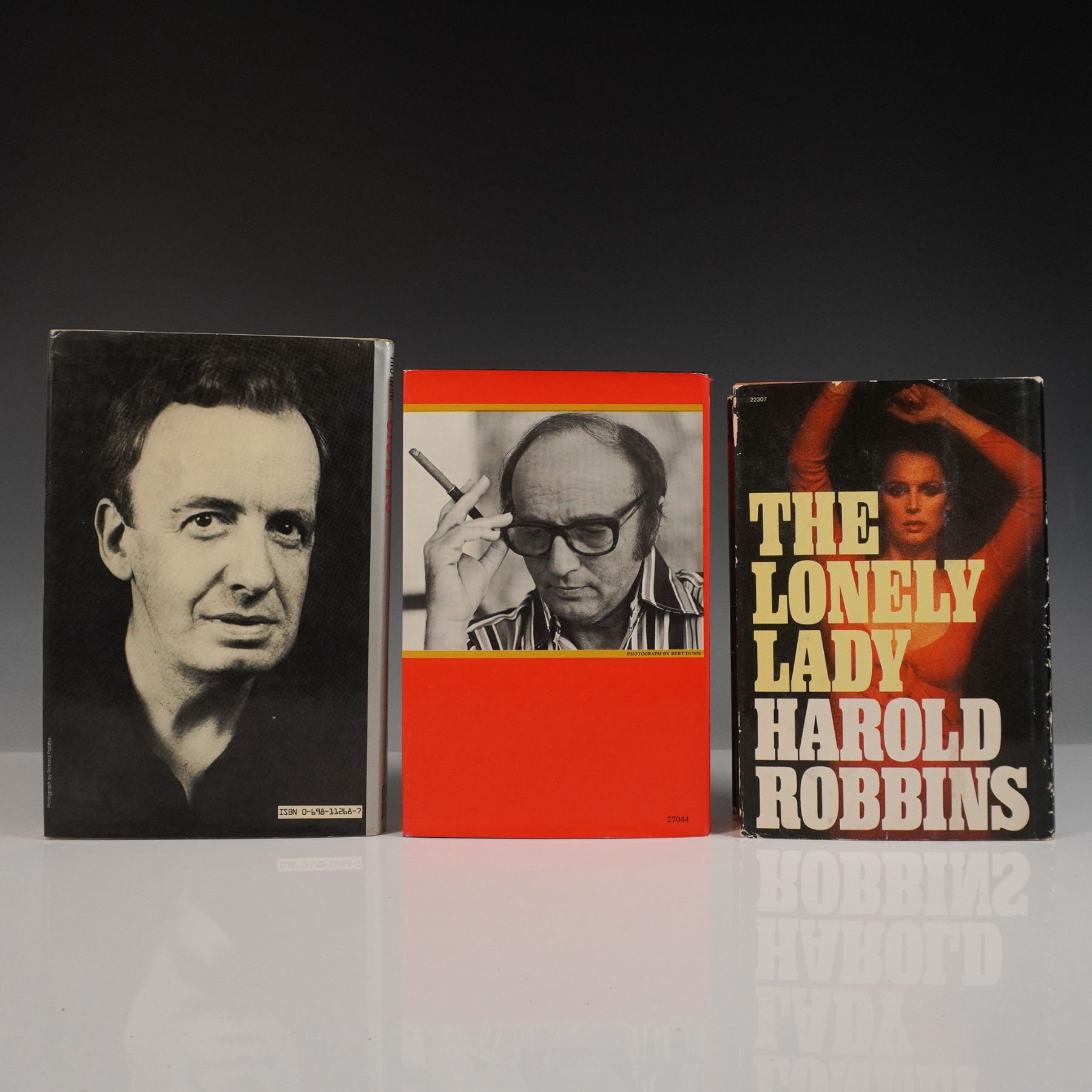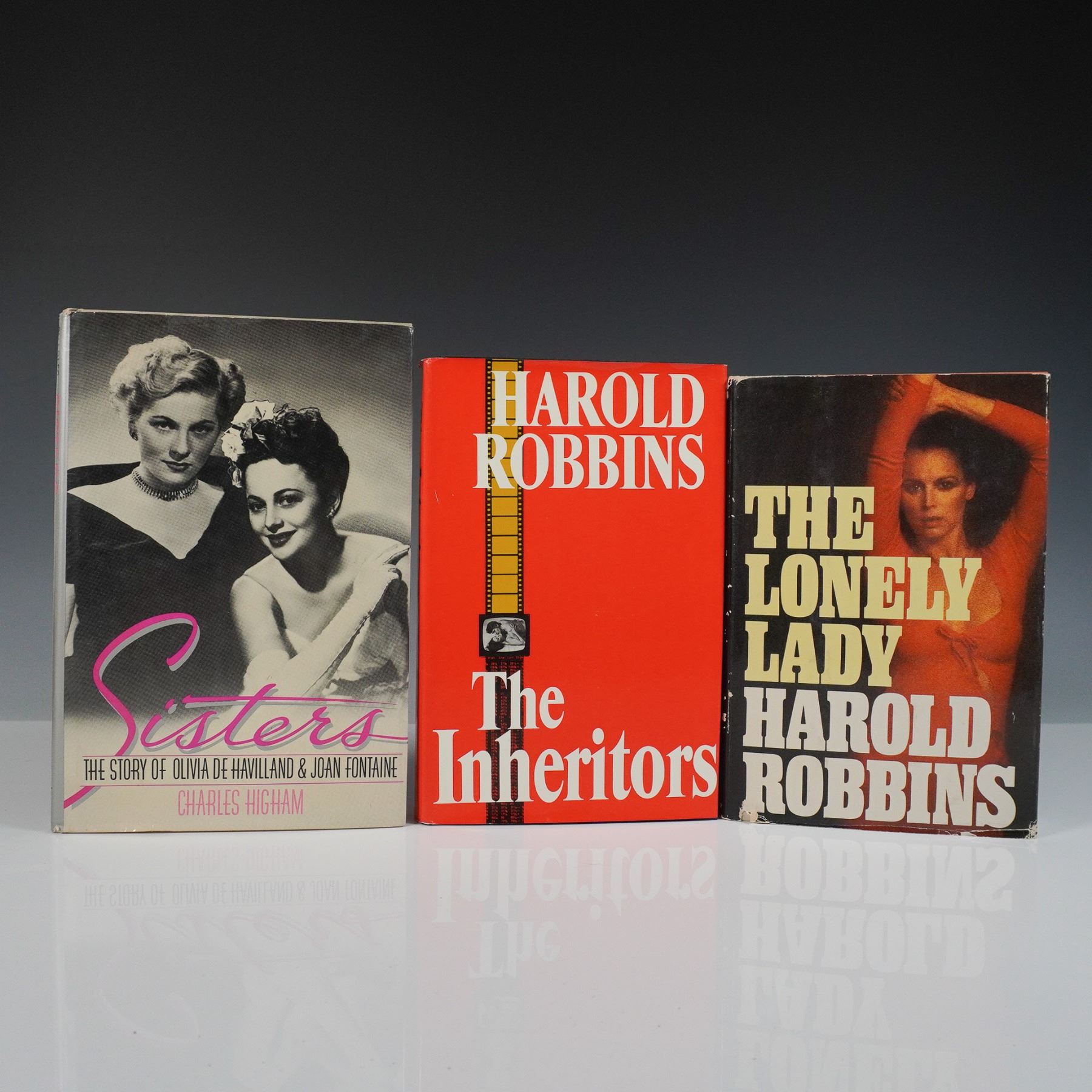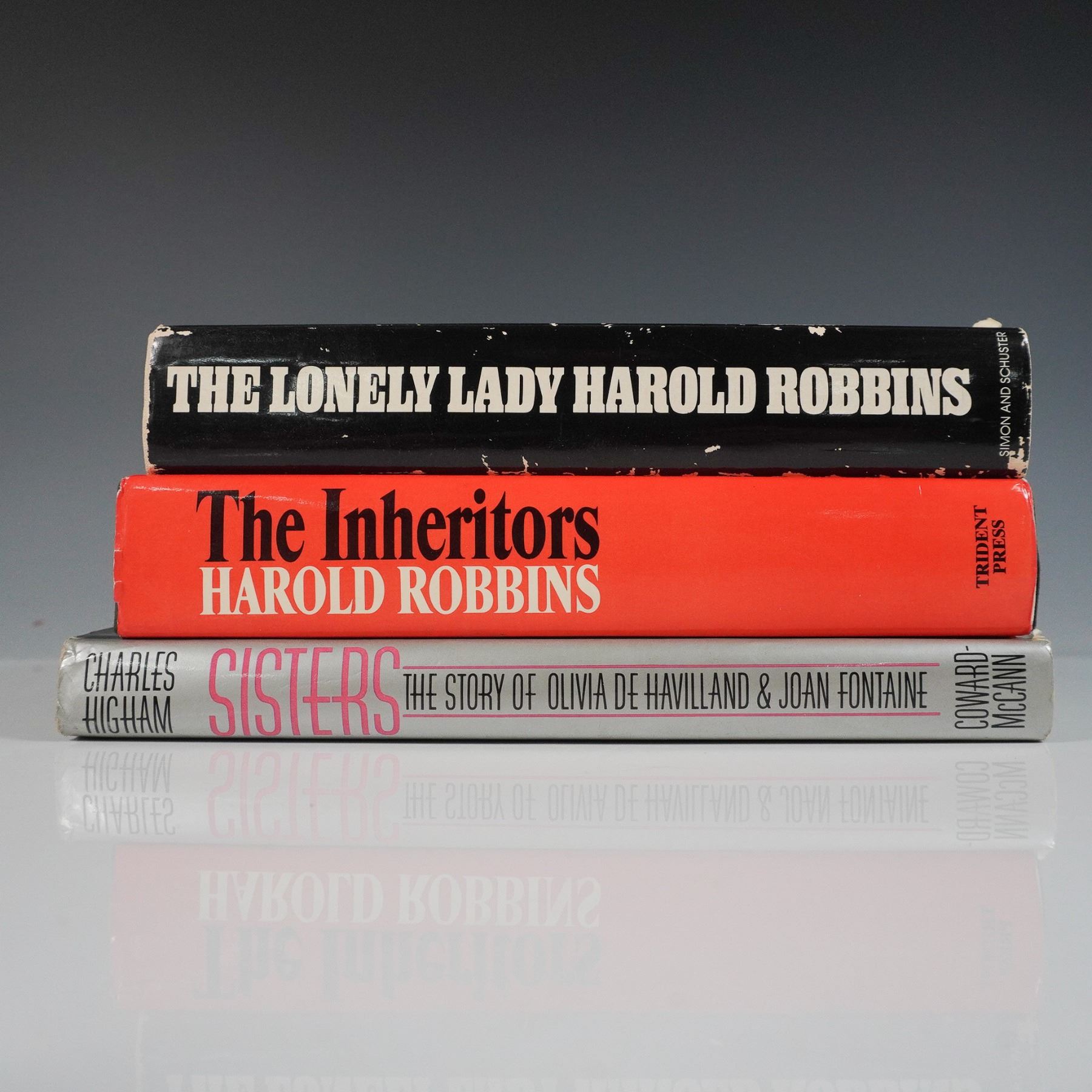 Titles including The Lonely Lady by Harold Robbins (1976), The Inheritors by Harold Robbins (1969), and Sisters: The Story of Olivia de Havilland & Joan Fontaine by Charles Higham (1984). The Lonely Lady and The Inheritors are novels by bestselling author Harold Robbins, known for his provocative storytelling. Sisters explores the tumultuous relationship between legendary Hollywood actresses Olivia de Havilland and Joan Fontaine. A compelling mix of fiction and biography. The dimensions of the collection measure approximately 9.25"H x 4"W.