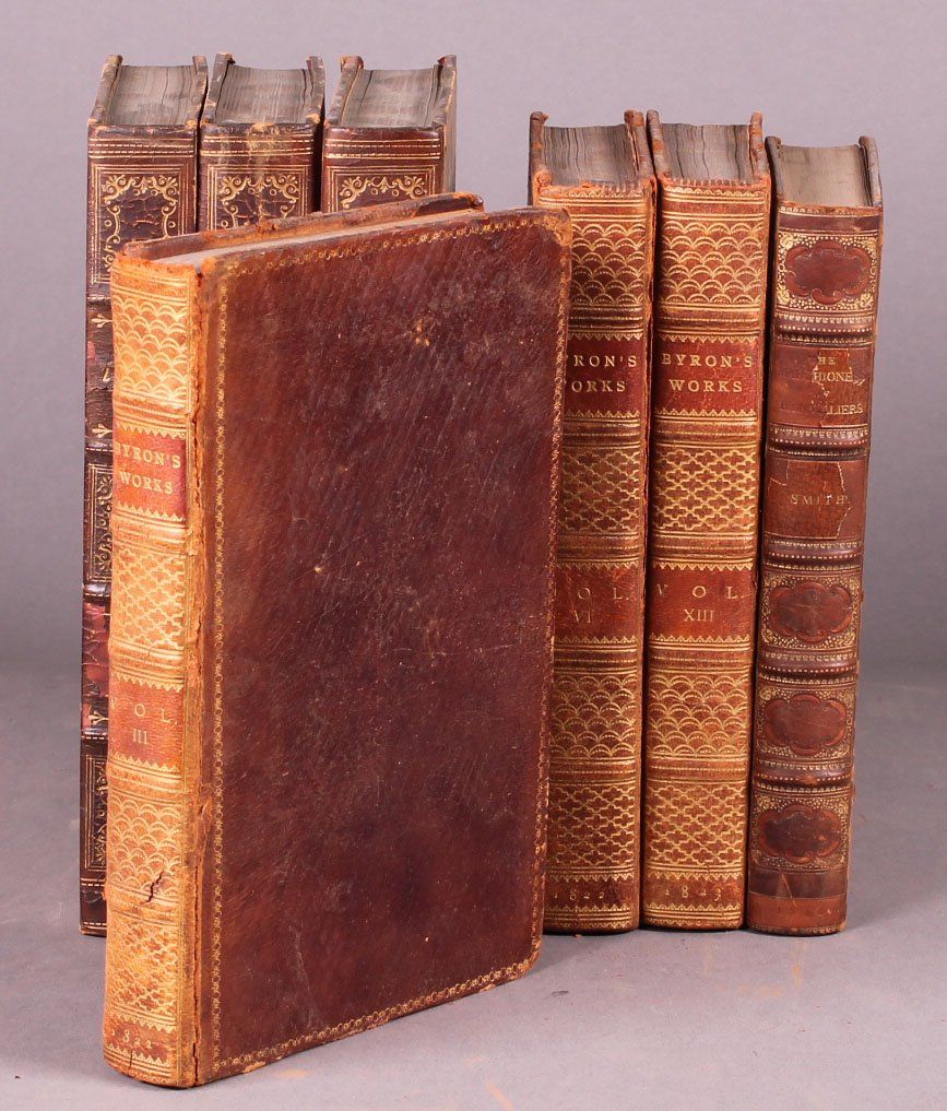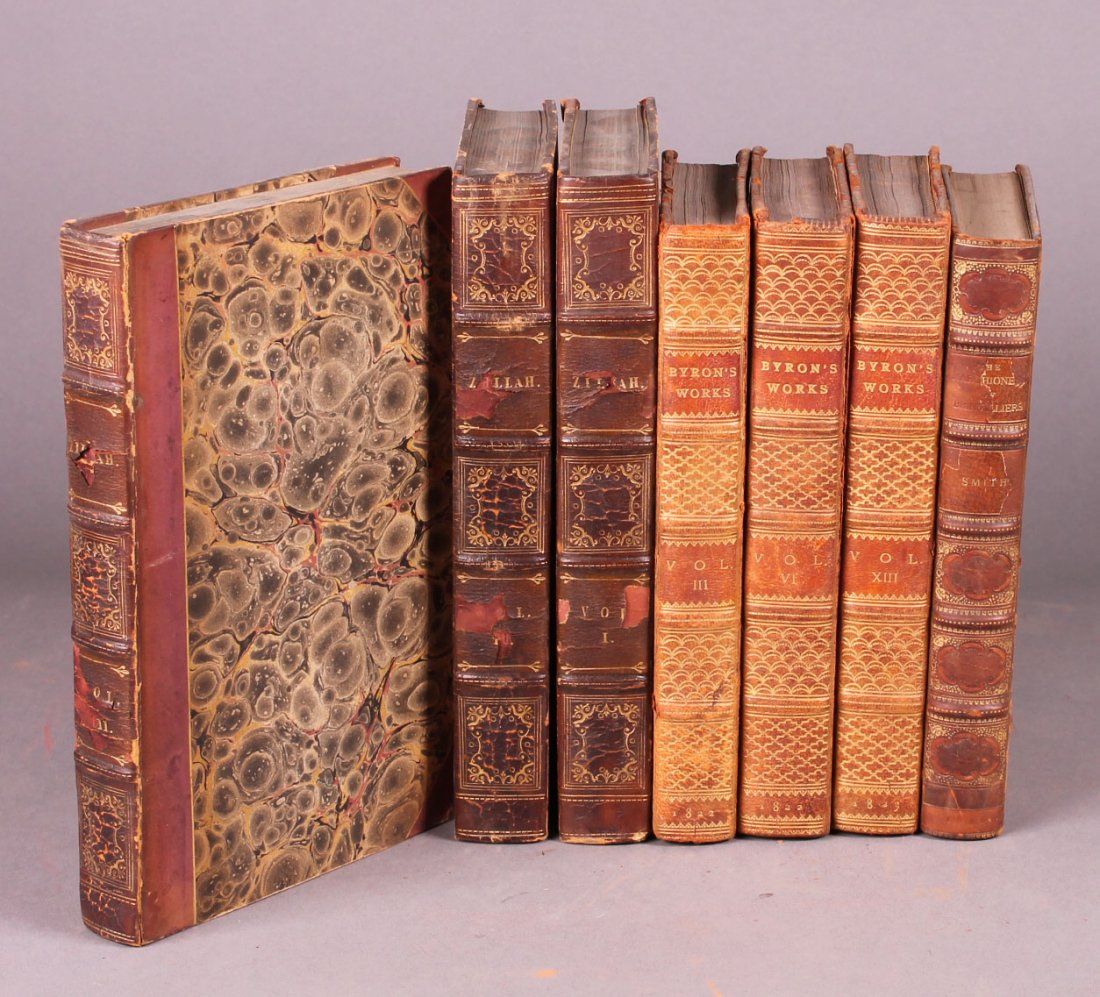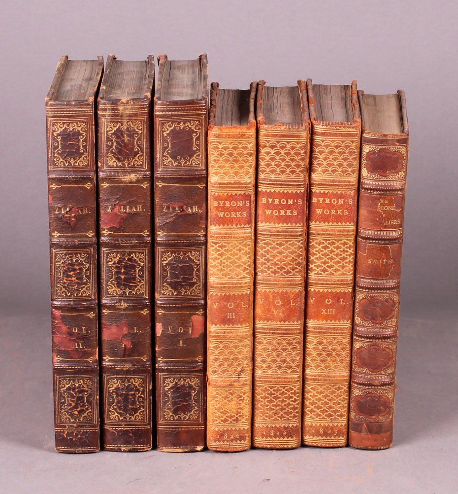 [Literature]. 3 Titles (7 Vols). 8vo/4to. 19th Century half/full leather. ++ THE WORKS OF LORD BYRON? 3 Vols: Vols III, VI, XIII. Paris: A. and W. Galignani, 1822, 1823. Last work included in Vol XIII is ?The Deformed Transformed,? which carries a separate title page dated ?1824?. Vol III: [7], [4]-293pp. Vol VI: [3], vi-viii, 321pp. Vol XIII: [9], 6-206, [ii], [2], [7] 6-101pp. ++ ZILLAH; A Tale of the Holy City. 3 Vols. Lon: Henry Colburn, 1828. ++ Albert Smith. THE MARCHIONESS OF BRINVELLIERS, the Prisoner of the Seventeenth Century. A Romance of Old Paris. Lon: Richard Bentley, 1846. ++