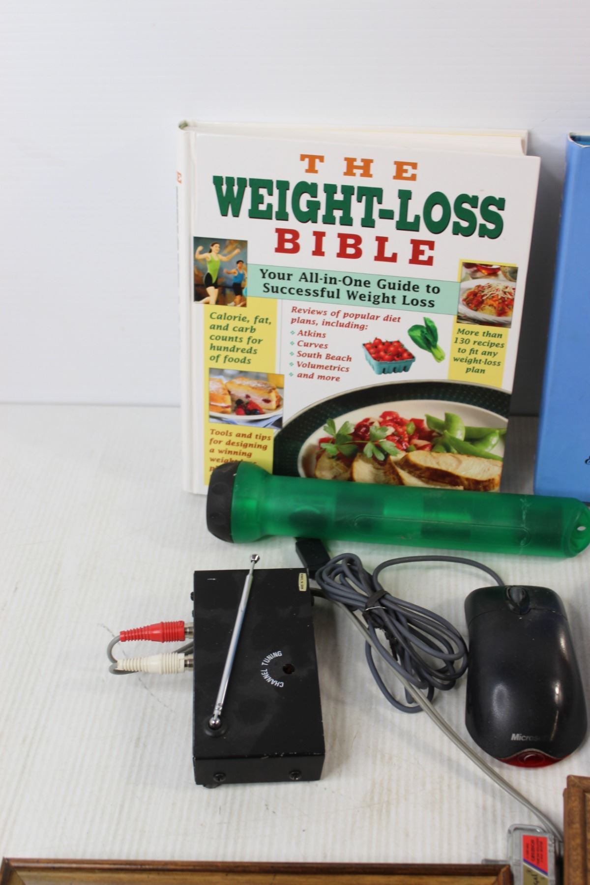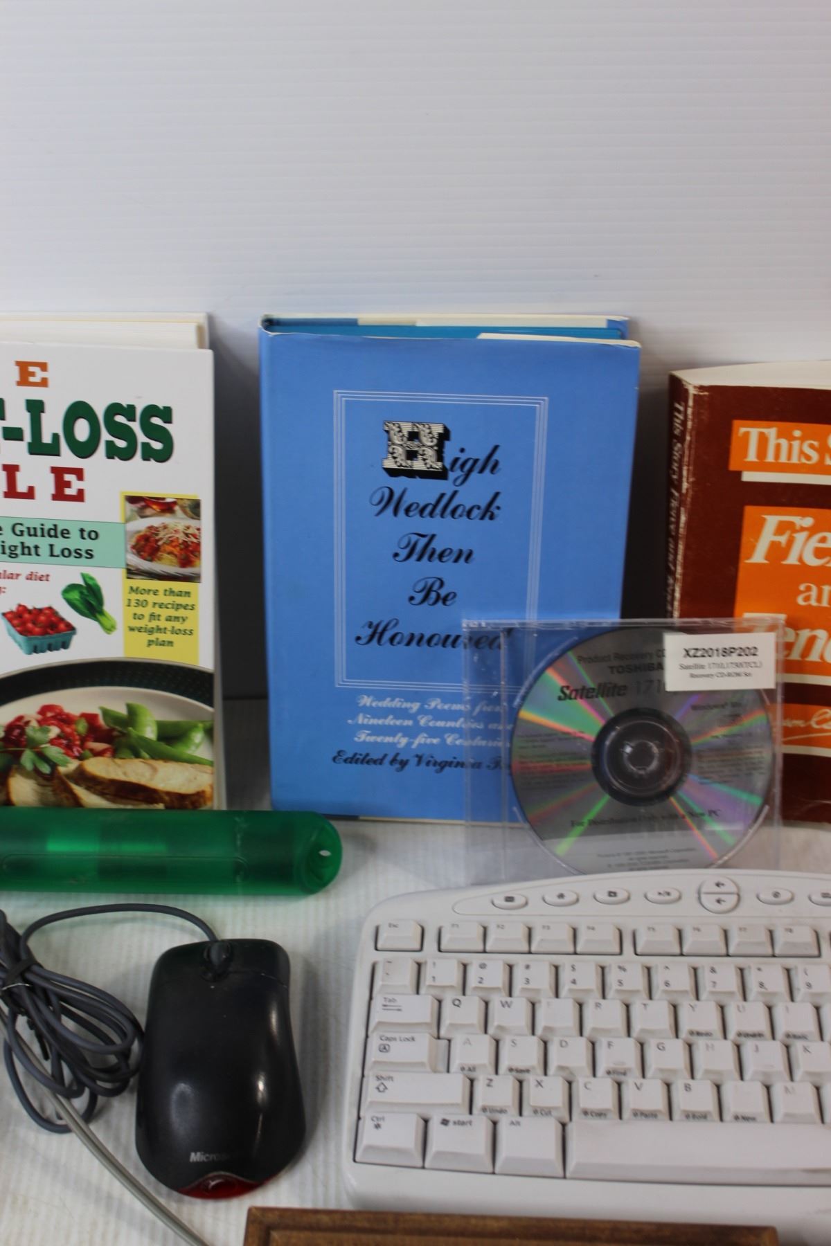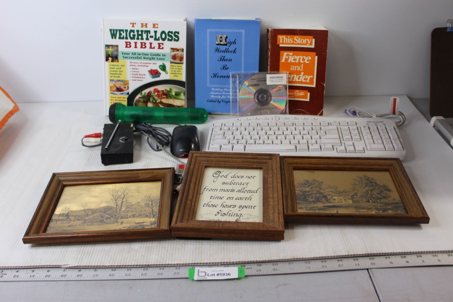 (3) Books, Flashlight, Keyboard & Mouse, (3) Pictures