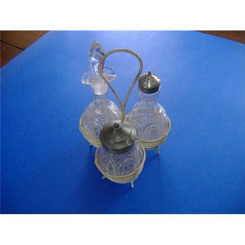 A Castor Set unual 3 bottle set in a wire stand that has been painted white. Should appeal to those who collect castor sets and those who love old wire objects
