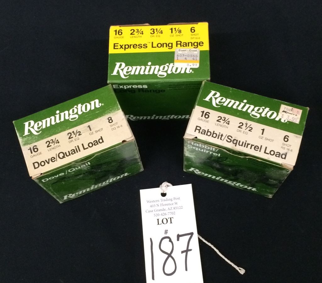 You get 3 boxes of .16ga shotgun shells for 1 money in this lot! Please look closely at pics to see what you will get. Disclaimer: These items are sold as components only! They have been opened. In addition, the following States have laws regulating Ammunition Sellers and/or the Sale of Ammunition: California, Washington DC, Maryland, Massachusetts, Minnesota, New Jersey, New York and Washington State. We WILL NOT ship ammo to these states. Period. We will not ship ammo out of the USA either. If you buy this lot from a place listed above, you will need to pick it up, or have it picked up for you, at our store is Casa Grande, AZ.