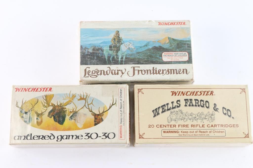 (A) Legendary Frontiersman .38-55. Very good. Normal aging. Good artwork on top. Opened full box. (B) Wells Fargo & Co .30-30 in V.G. to near fine condition. Opened full box. (C) Antlered game .30-30 in V.G. plus condition. Opened full box.