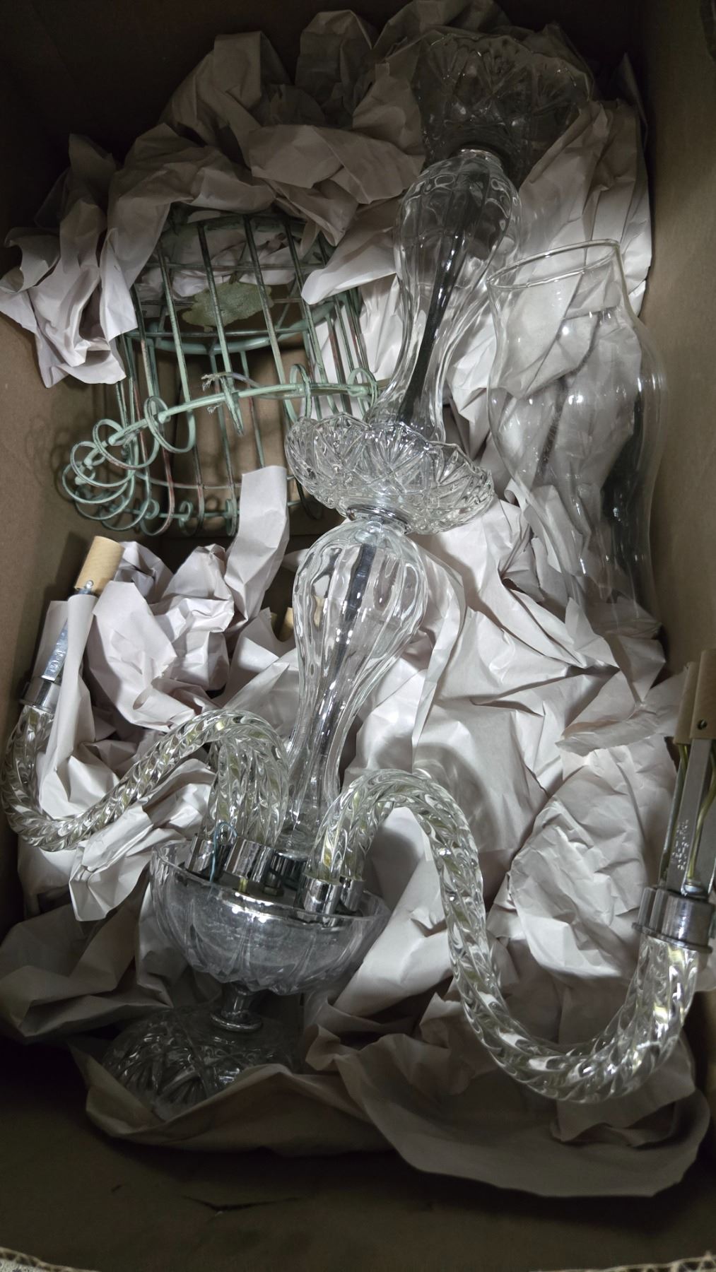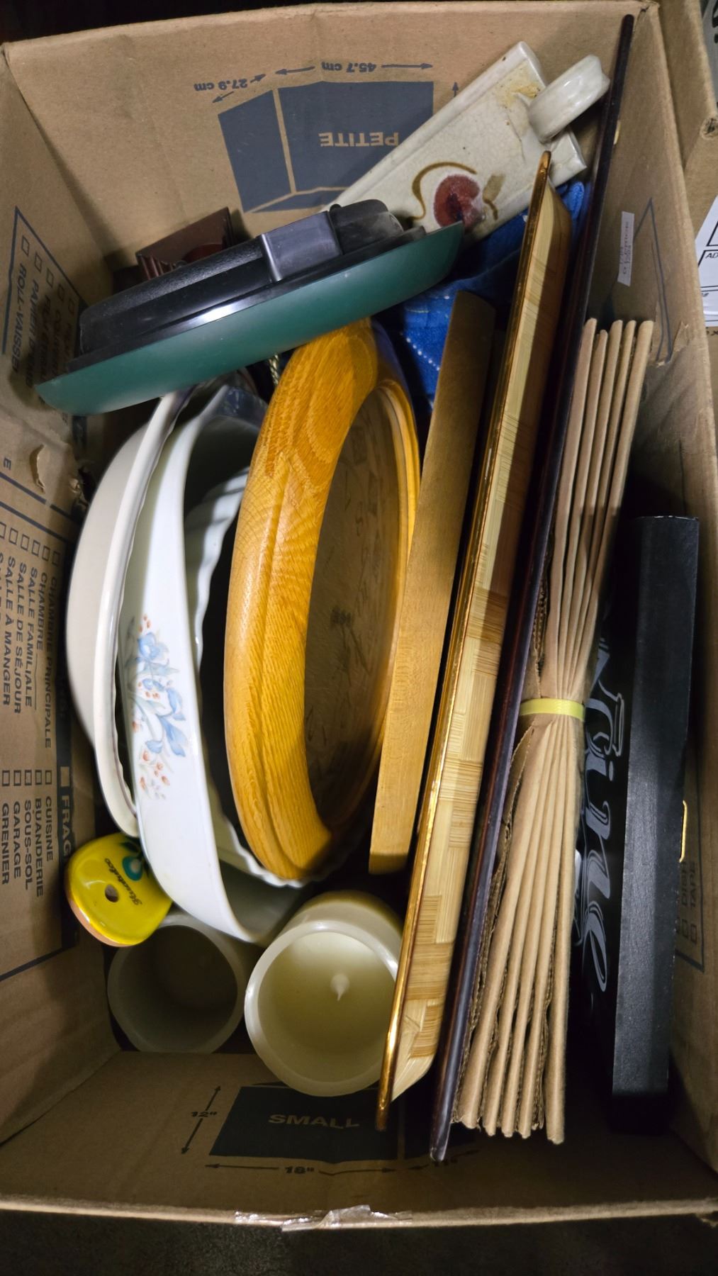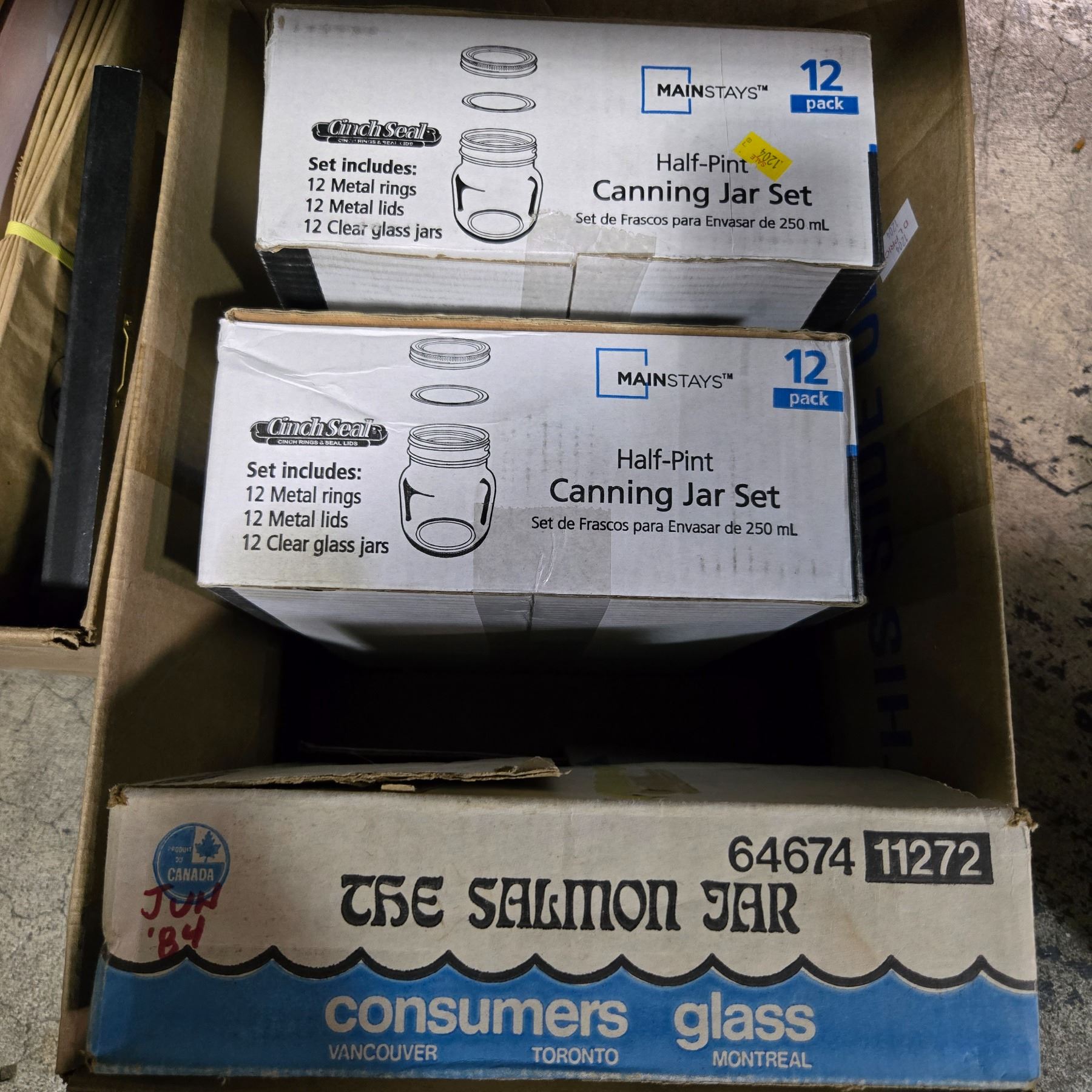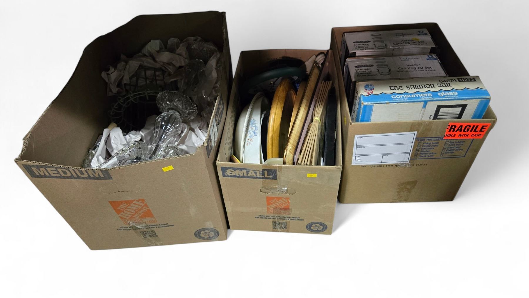 3 Boxes of Misc Household Items - Glass Pendant Light, Canning Jars, and Kitchenware Assortment