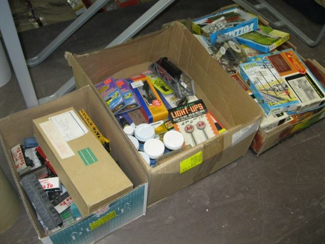 3 Boxes of misc Railroad put together Buildings, Paints etc.