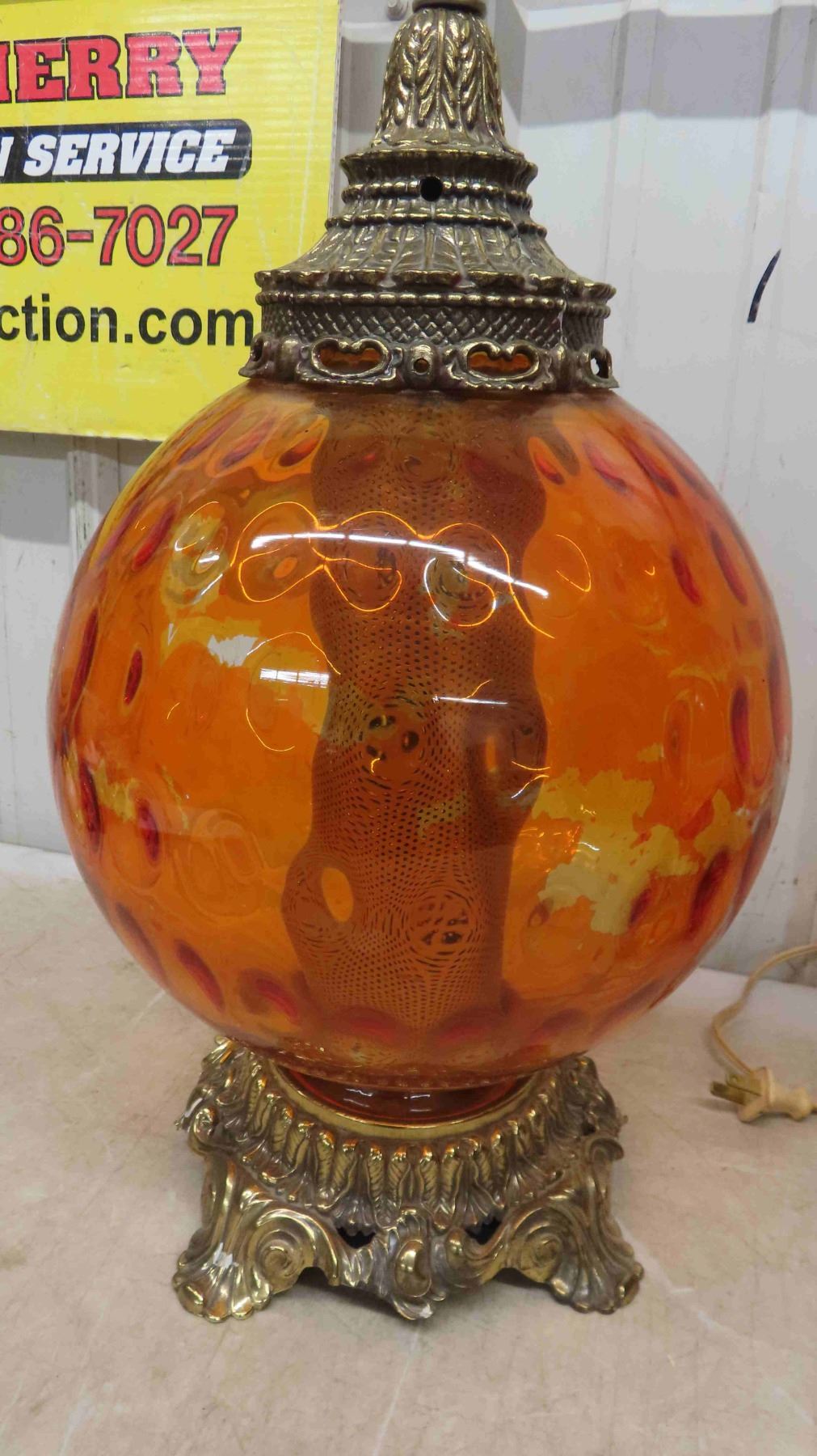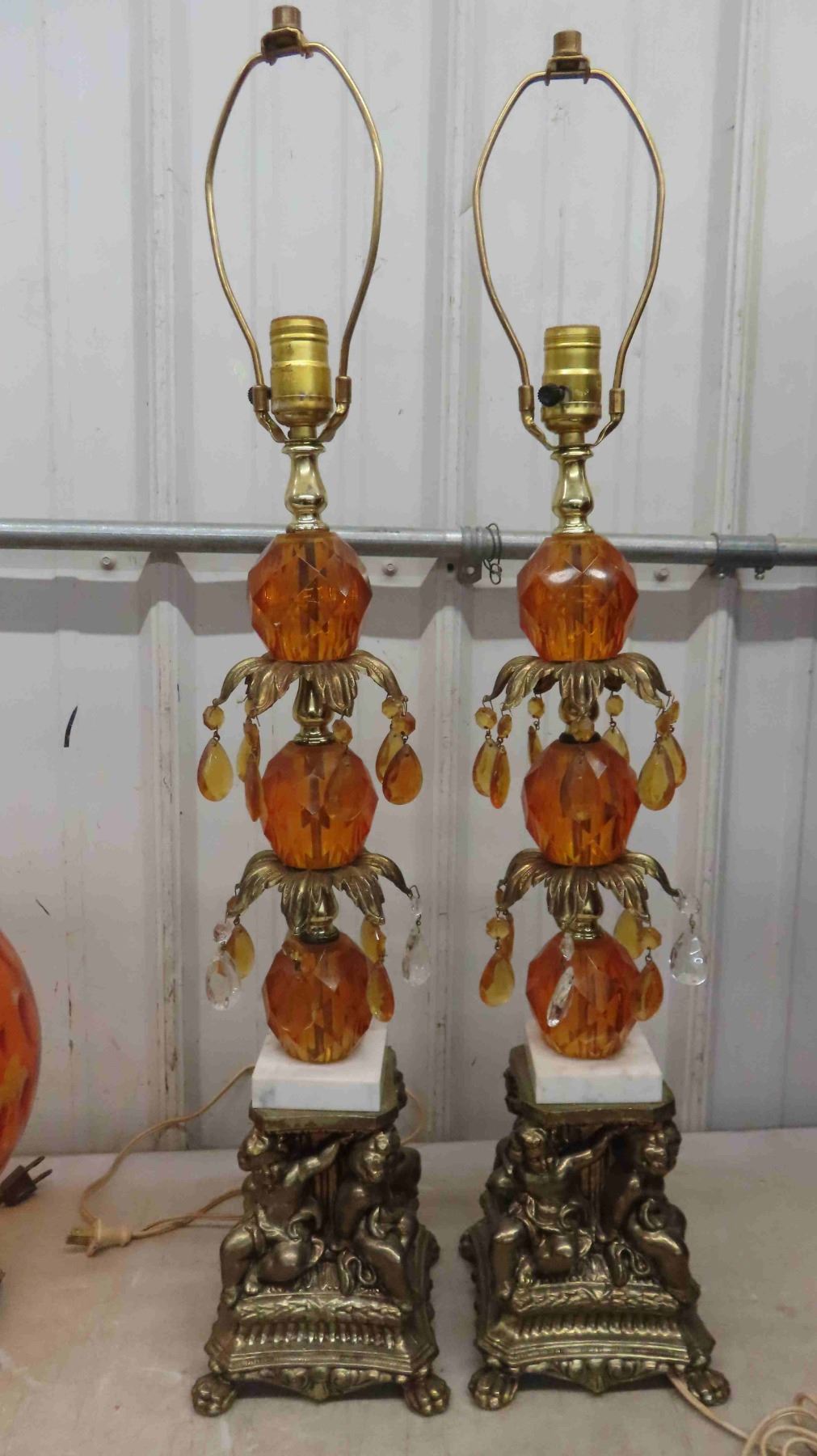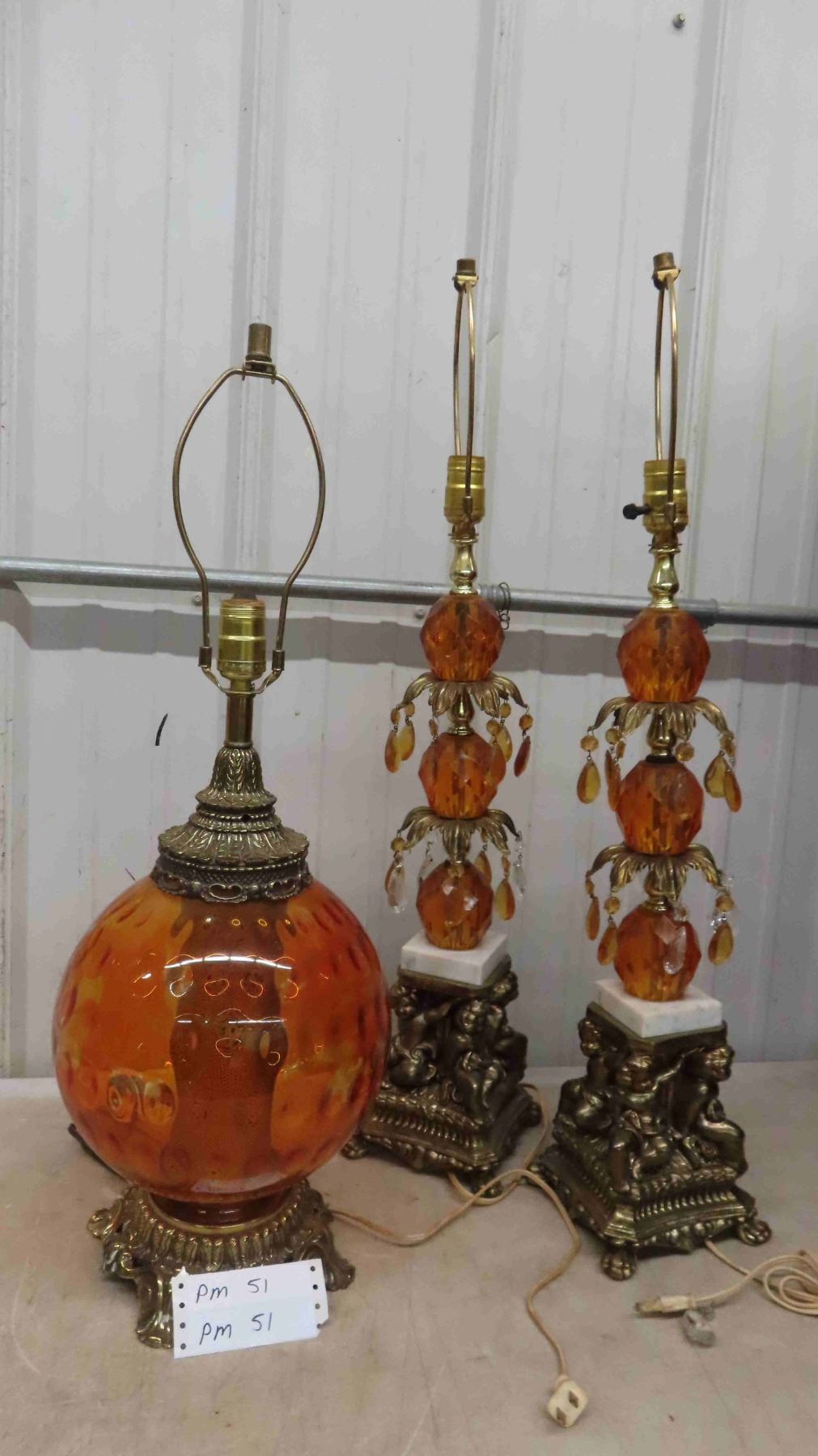 3 Brass + Amber Colored Table Lamps : (2) 31 , (1) 28  - NO Shades