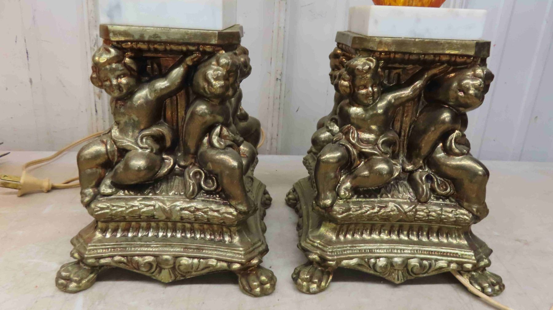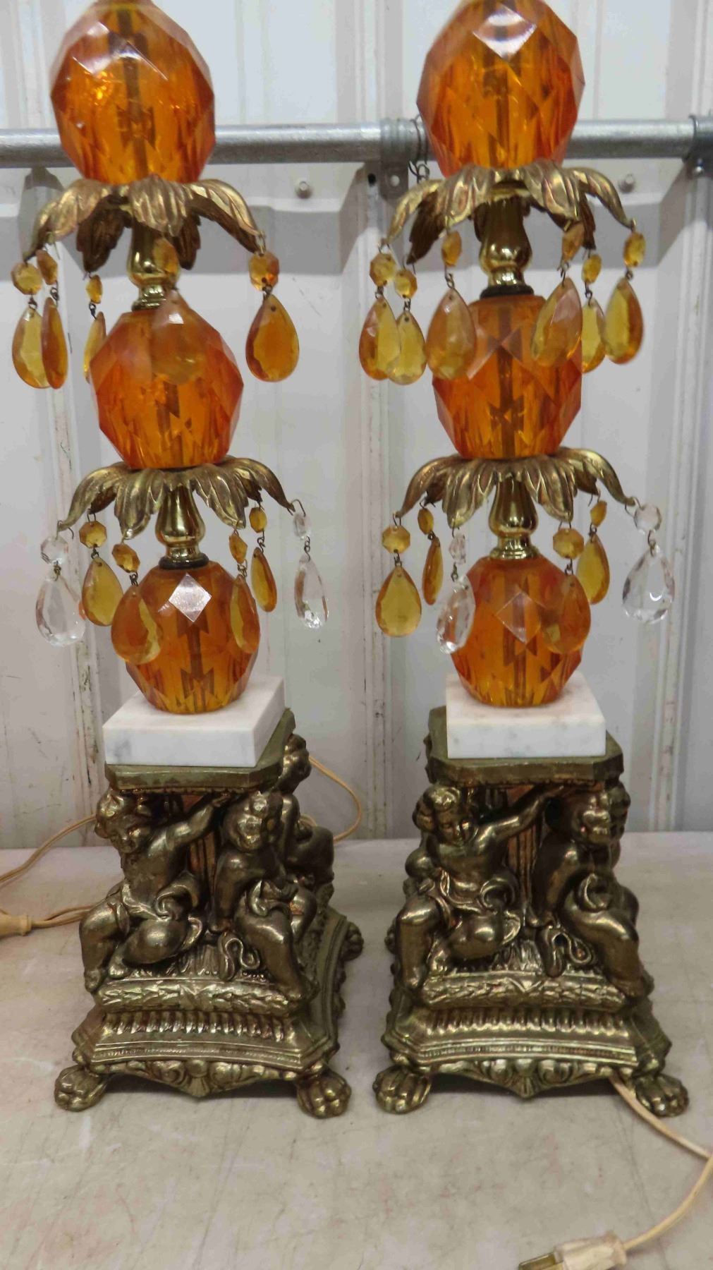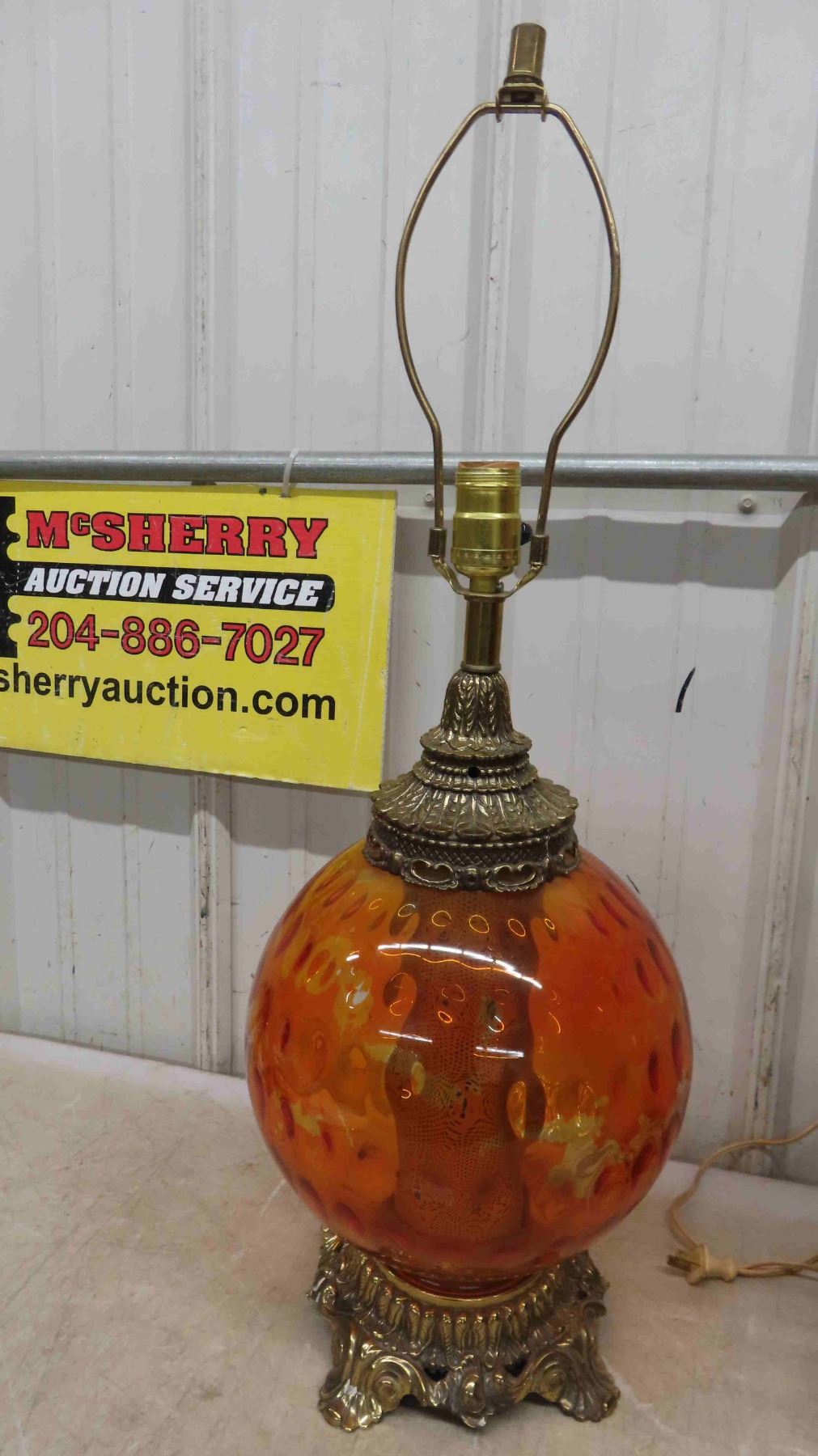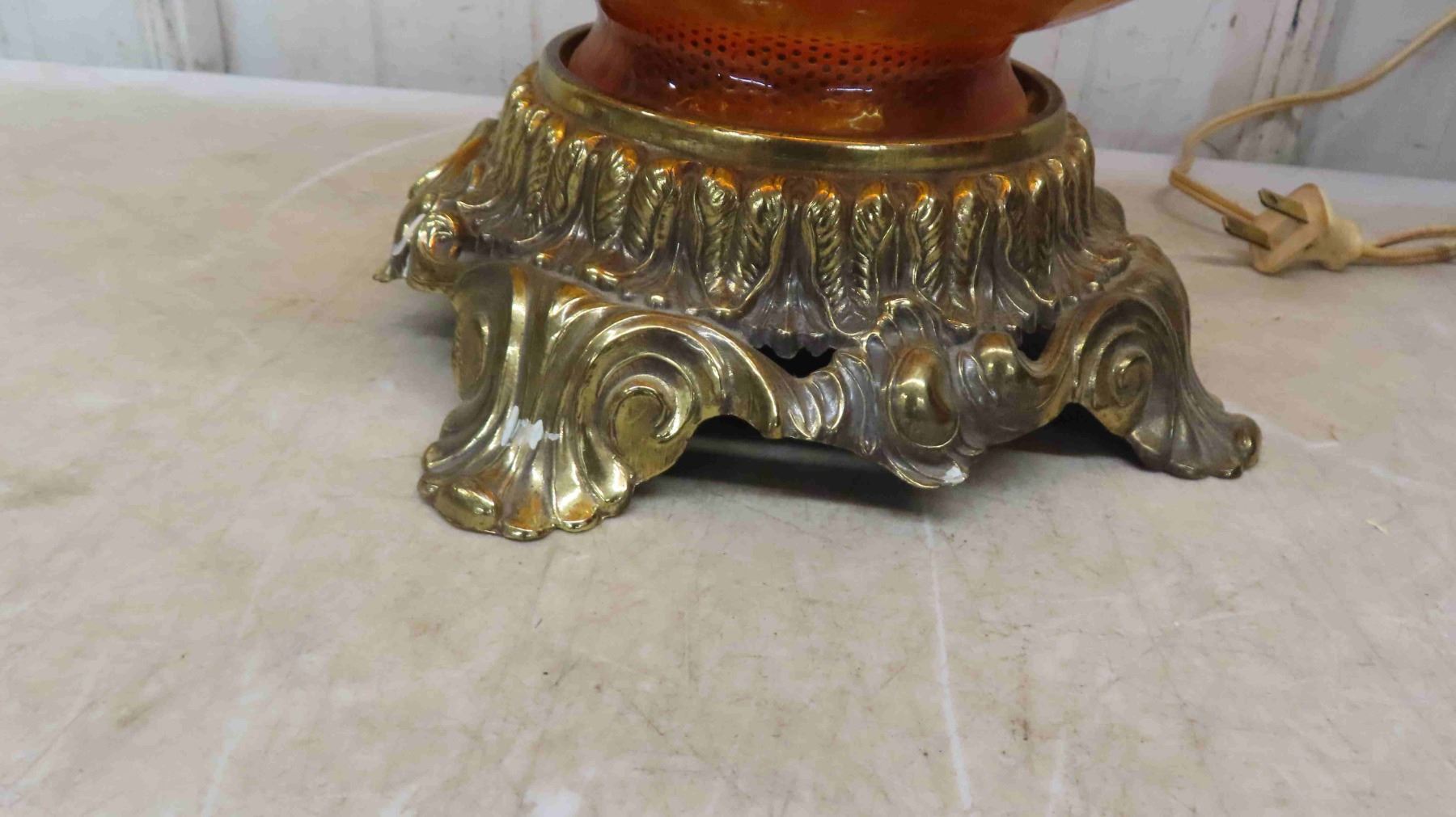 3 Brass + Amber Colored Table Lamps : (2) 31 , (1) 28  - NO Shades
