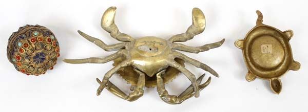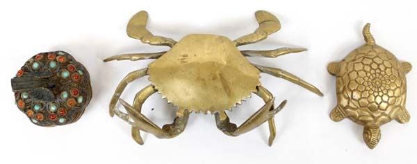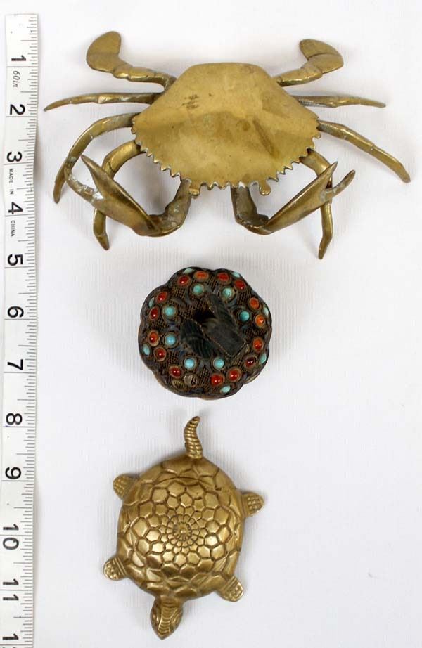 3 Brass Trinket Boxes, 1. Jeweled Apple Lidded Trinket Box, missing one jewel 2. Brass Lidded Turtle Trinket Box 3. Brass Lidded Crab Trinket Box, largest is the crab measuring 2'' x 6''