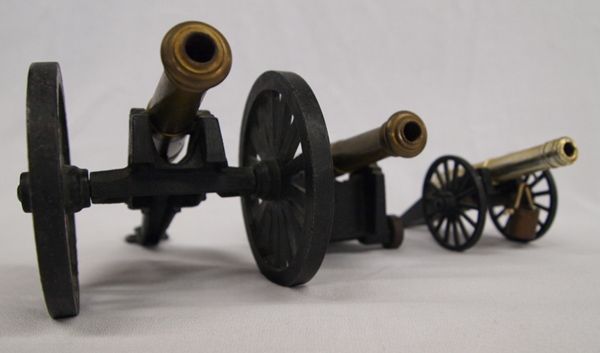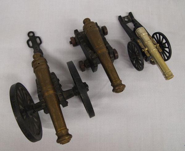 3 Brass and Cast Metal Miniature Cannons, largest measures 7.5''L x 3.5''W, #1 Civil War Cannon Replica is marked MF Co. C 1/3 #2 Old Vtg Collectible GP 382 Military Cannon Made In Italy, comes with Ammo Bucket, marked GP 382 Made in Italy #3 Stamped MF Co. 1/4 Cannon Replica